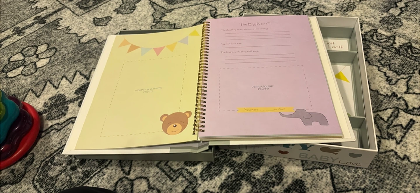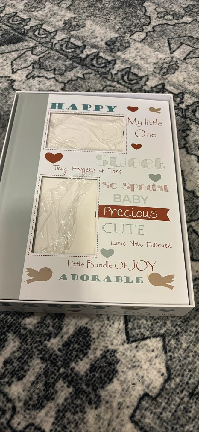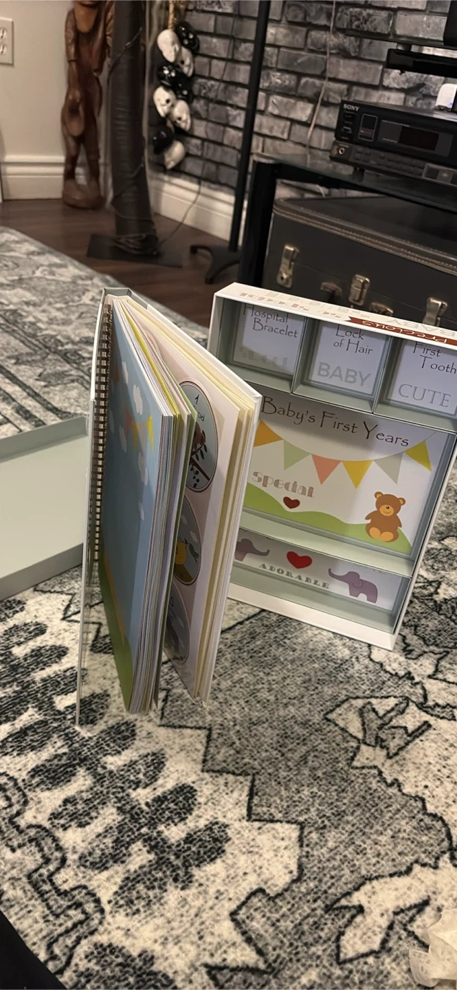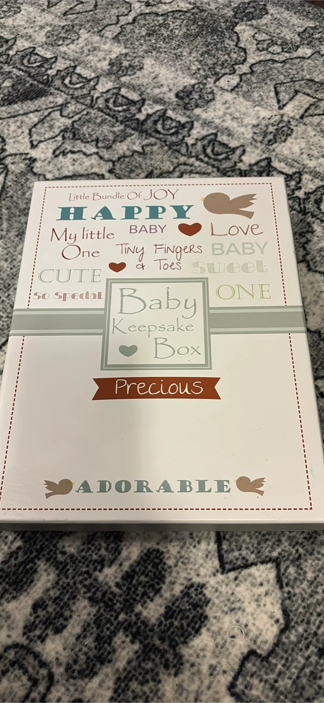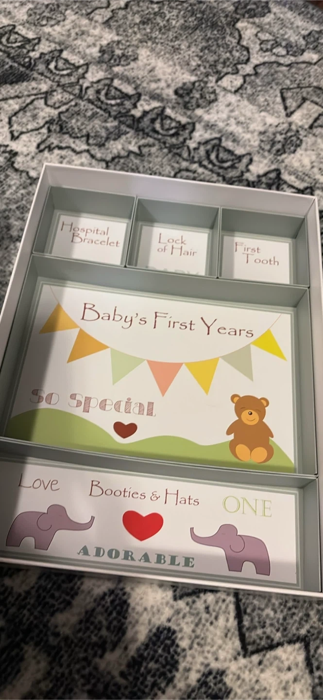 Selling a baby keepsake box to store all those precious first moments! This adorable box has compartments for things like a hospital bracelet, a lock of hair, and their first tooth. It also includes a baby book to document all of baby's first years. A perfect way to keep those memories safe!