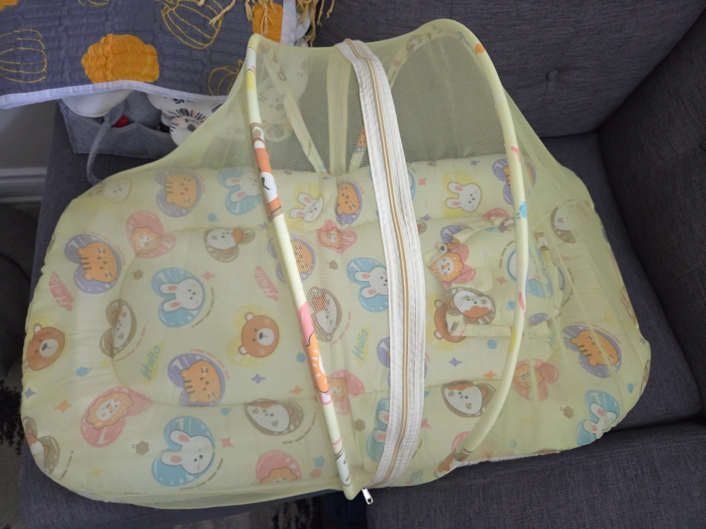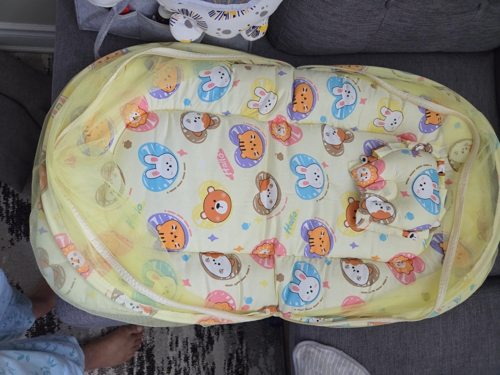 Here's a baby lounger and mosquito net bed in great condition! It features a cute pattern with bunnies, bears, and tigers on a yellow background. Perfect for keeping your little one safe from bugs while they sleep or play