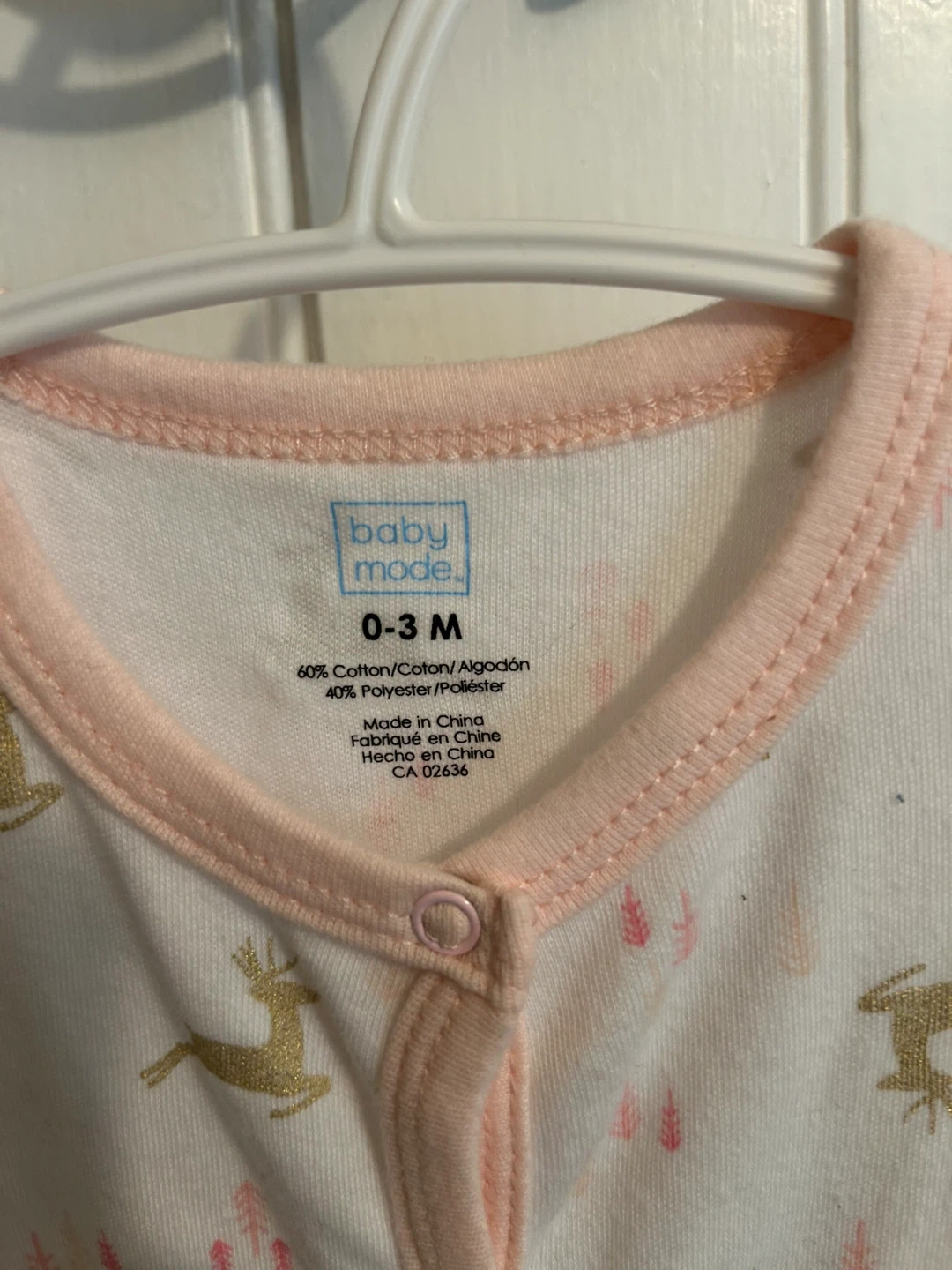 Baby mode brand. Button up sleeper. White with gold & pink deer print. Size 0/3m. Brand new condition $5 Pickup between kincardine & ripley or I can arrange delivery in port Elgin-Owen sound, walkerton-Durham, wingham-listowel-kw/cambridge, goderich-bayfield, Woodstock & Arthur-Orangeville-Newmarket-Lindsay-Peterborough AREAS.