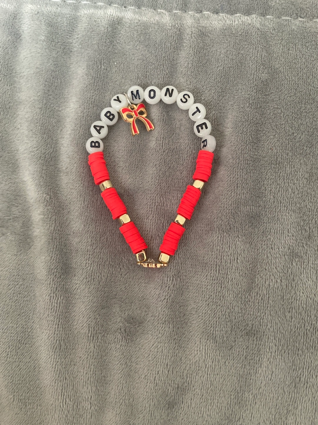 Check out this cute Baby Monster beaded bracelet! It features white round beads with the words "BABY MONSTER", red disc beads, and gold-coloured accents and a bow charm. It's in great condition and ready for a new home