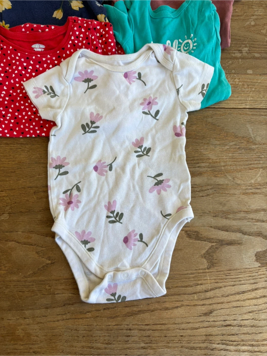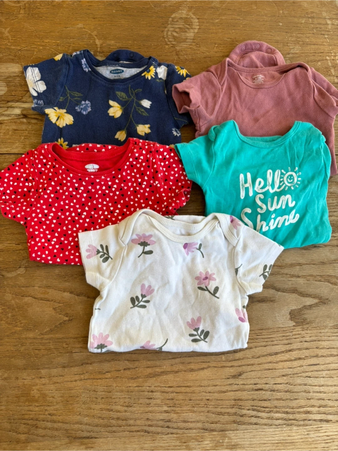 A set of five adorable baby onesies, perfect for your little one! They are size 6-12 months and feature a variety of cute patterns and colours. (Lot A1)