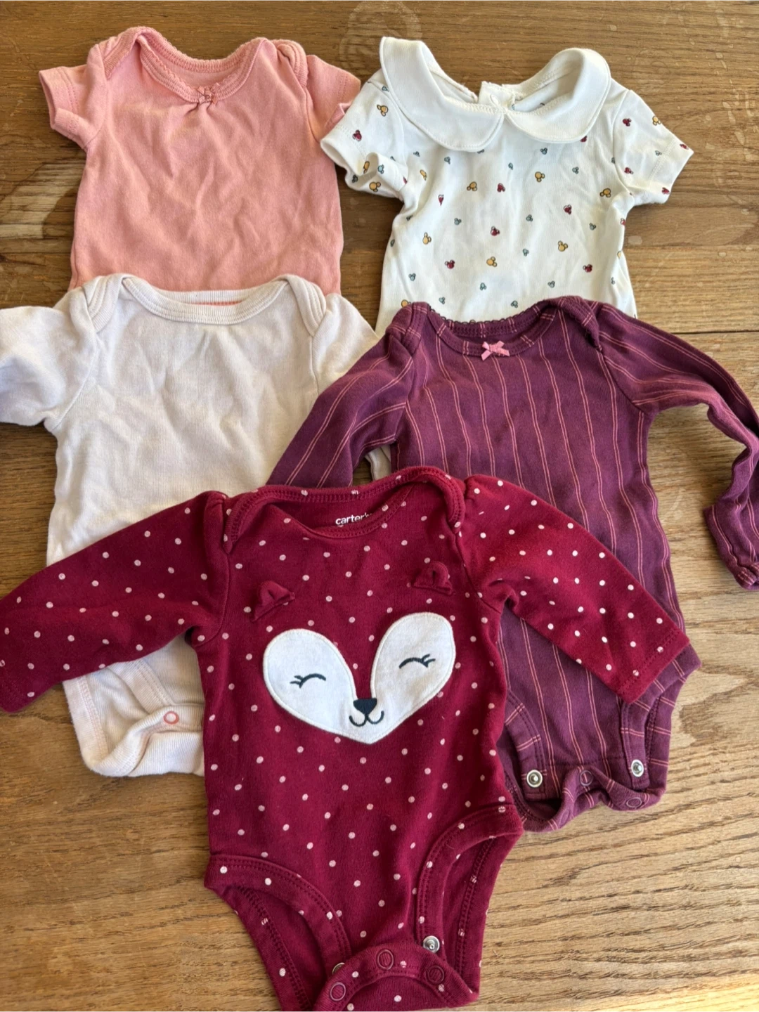 Selling a bundle of five baby onesies ! There are a variety of colours and styles included. They're all in great condition and ready for a new home. Perfect for your little one! (Lot A14)