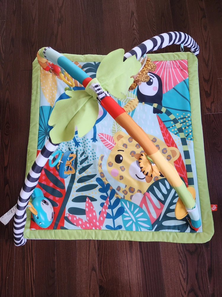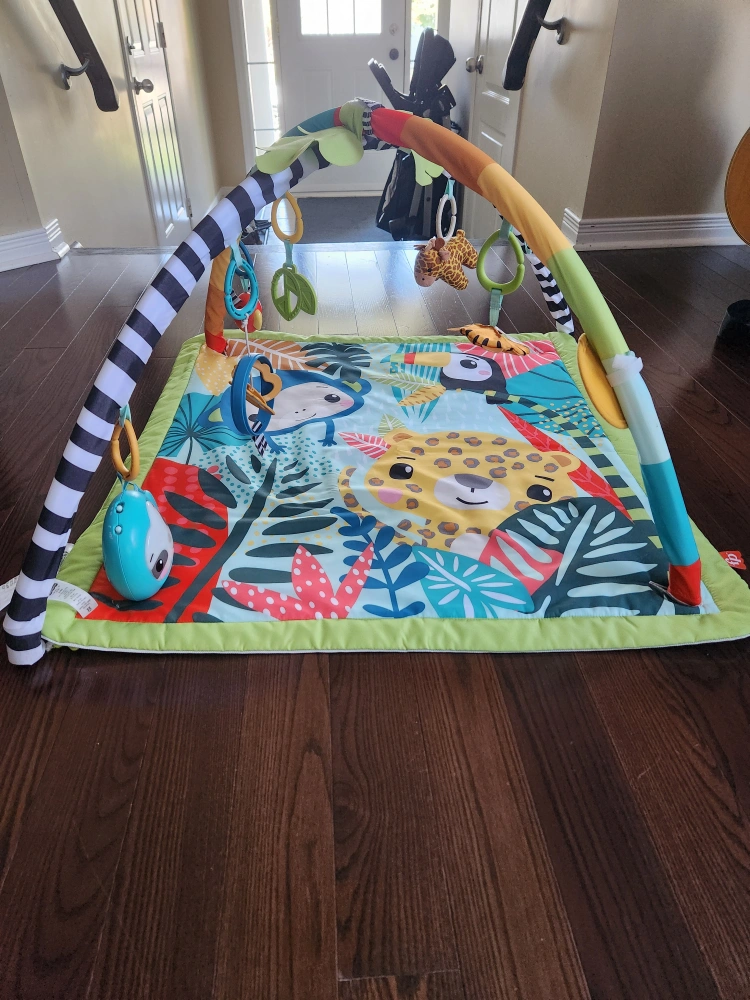 This colourful play mat features a removable arch with various hanging toys. The mat is machine washable.