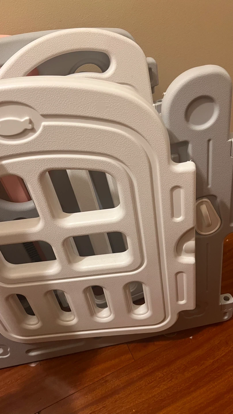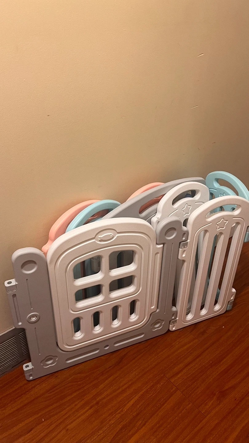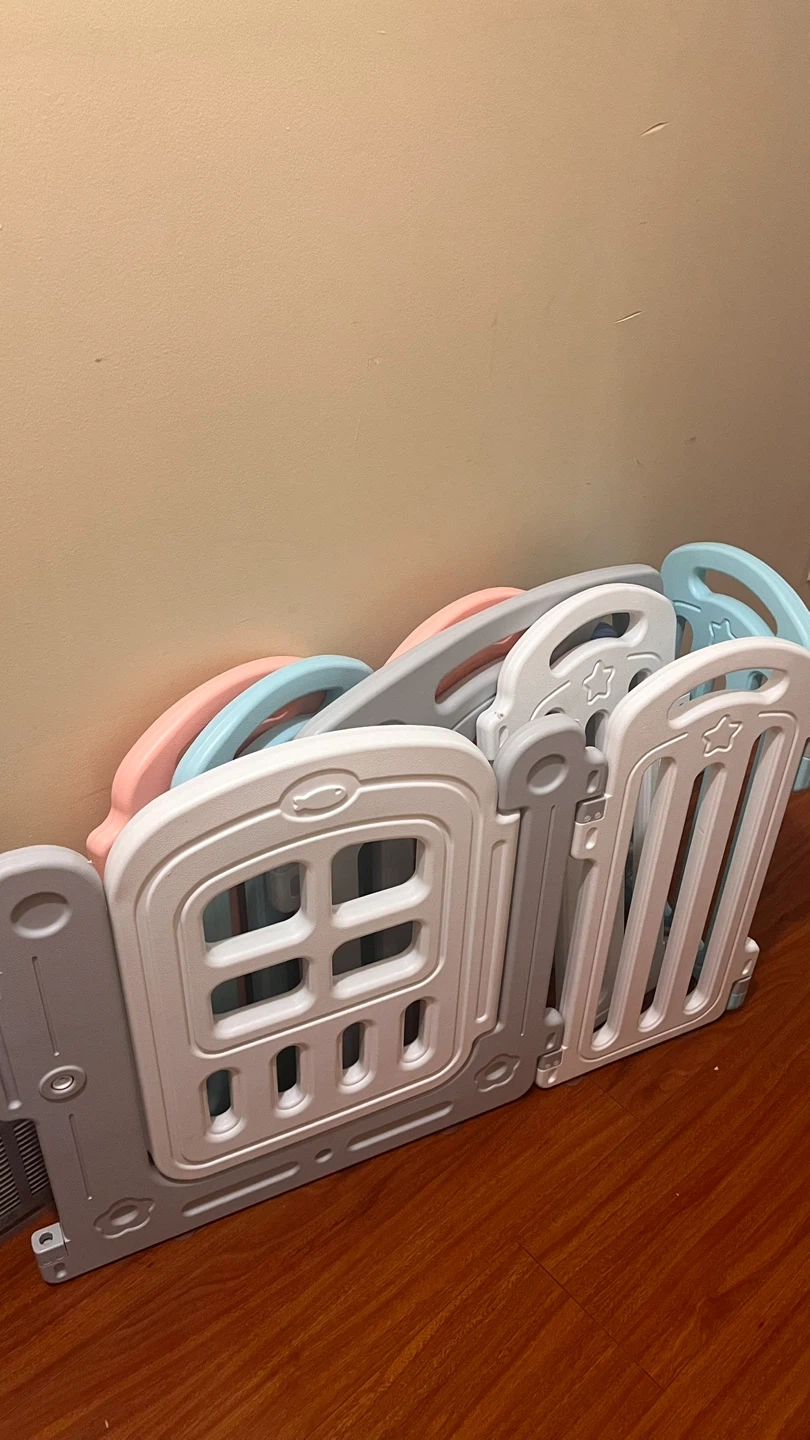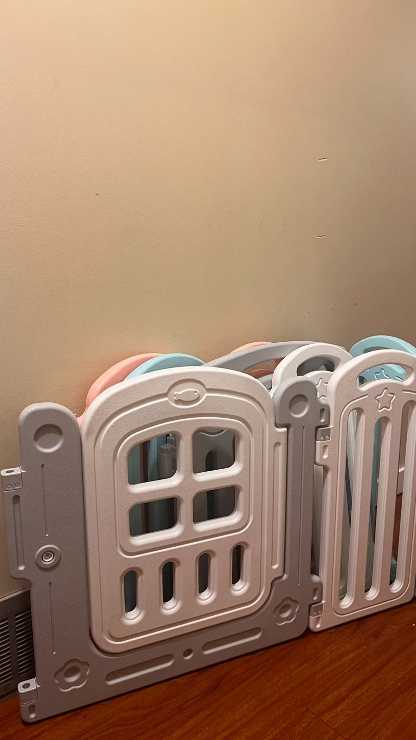 Selling a set of baby playpen panels in a mix of grey, white, blue, and pink. Great for creating a safe play area for your little one! The panels feature cute designs like stars and windows