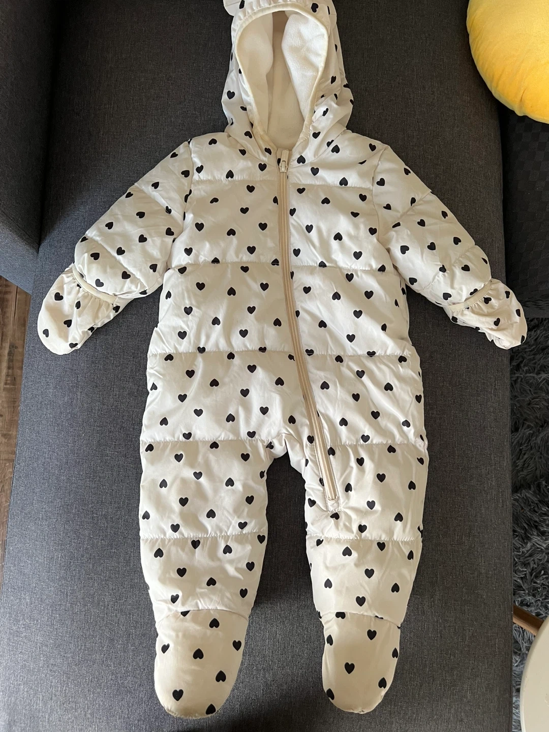 Super cute baby snowsuit with a hood and heart print. It's in great condition and perfect for keeping your little one warm during the winter months!