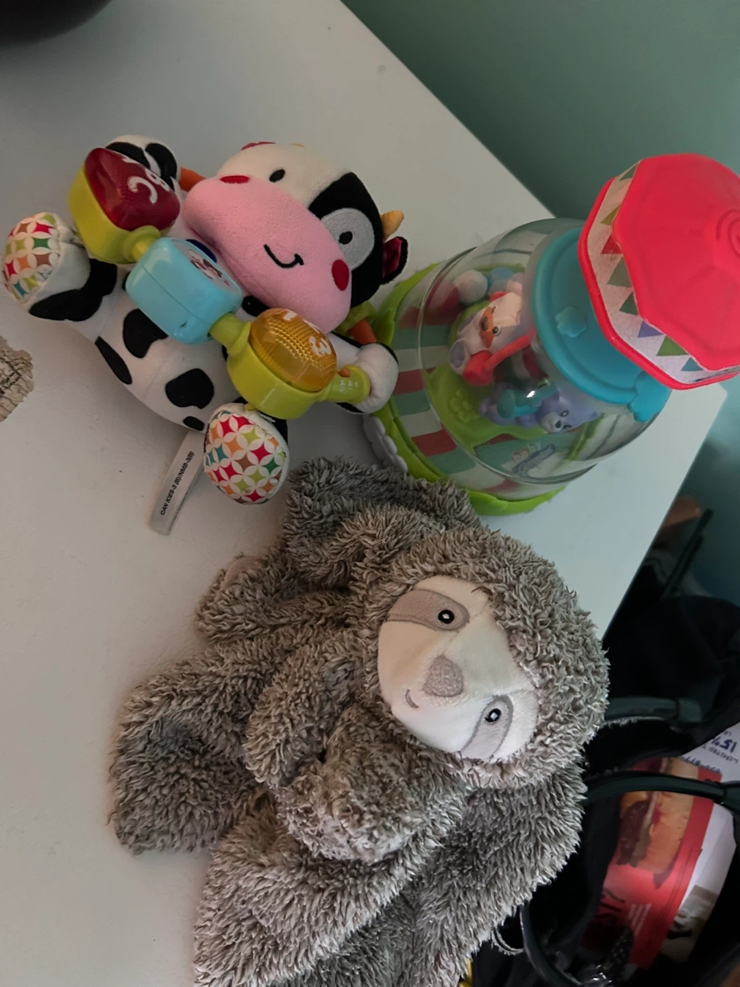 Selling a collection of baby toys! There's a cute cow plush with interactive elements, a soft sloth plush, and a colourful spinning toy. All in good condition and ready for a new home!