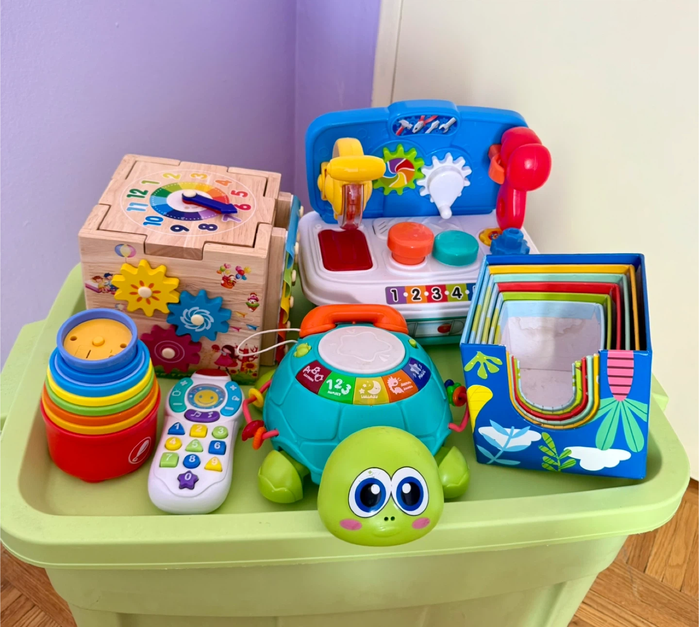 A collection of fun and engaging baby and kids toys! Includes a wooden clock cube, a turtle drum, a stacking toy, and more. Perfect for early learning and development