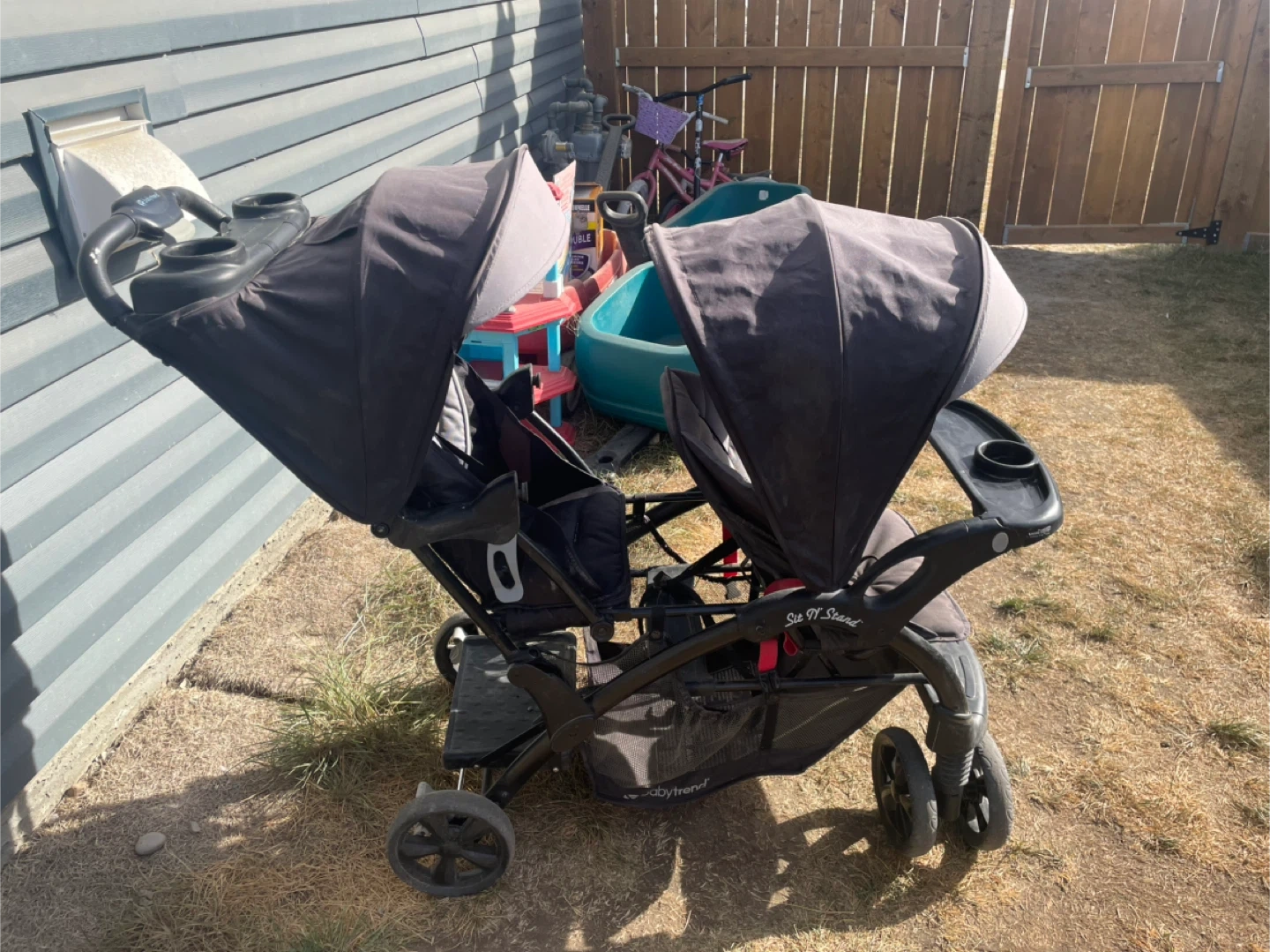 Selling a Baby Trend Sit N Stand double stroller. It's in great condition and ready for a new family! Perfect for parents with twins or children of different ages. The stroller offers multiple seating configurations, including a sit-and-stand option for older children who want to ride along. Great for walks around the neighbourhood or trips to the park Moving need gone asap must pick up