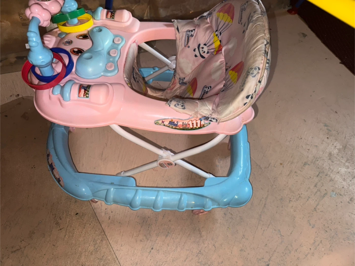 Selling a baby walker in pink and blue. It's in used condition but still has lots of life left! Perfect for little ones learning to walk and explore.