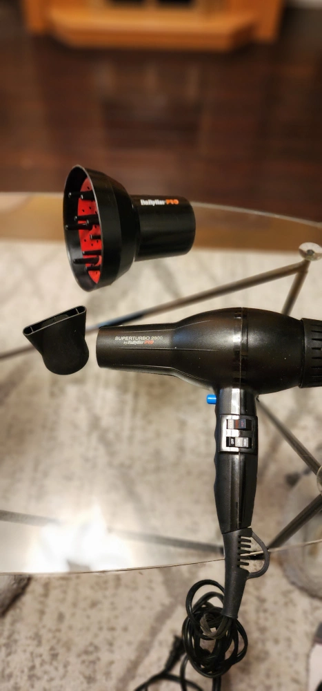 Professional salon hair dryer - 2000 watts with ionic and porcelin ceramic technology for a smooth, glossy finish and healthy hair. Reduces static and increases shine. Multiple heat and speed settings, including cold shot to lock style in. Includes concentrator perfect for round brush straightening. Paid $150 new. Bonus: Including a Babyliss universal diffuser attachment for free. Great for the days you want to mix this up with a curly look! Originally puchased separately. Note: The band that holds the diffuser in place has dislodged, so it no longer stays on the hairdryer by itself. Still works great, but needs to be held in place manually.