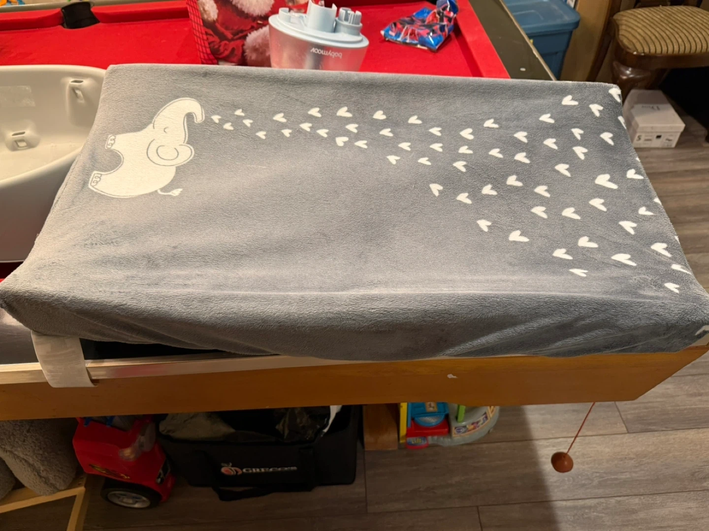 Changing pad and it’s cover with a cute elephant and heart design! This soft, grey cover fits standard changing pads and is in great condition. Perfect for adding a touch of whimsy to your baby's nursery