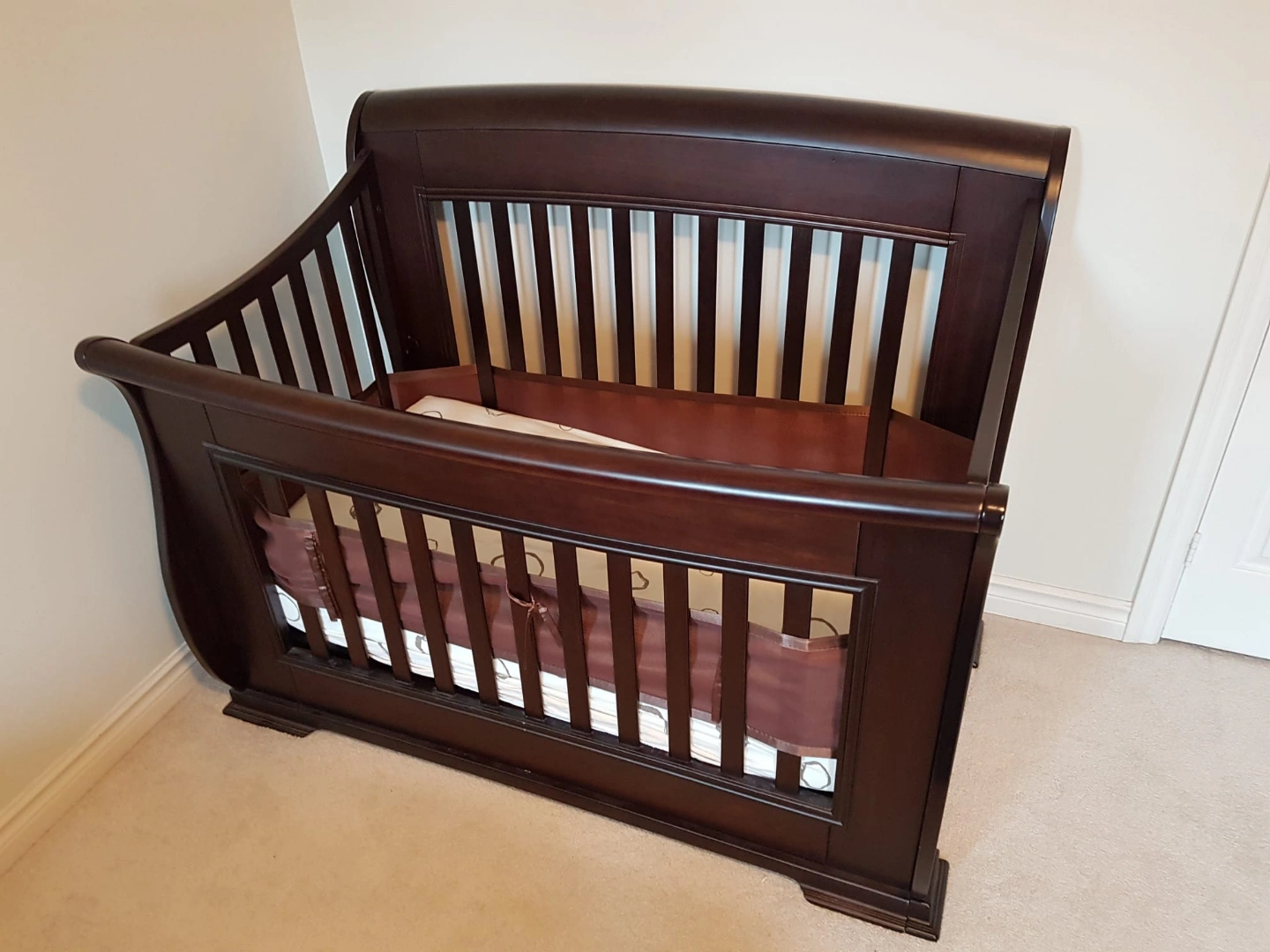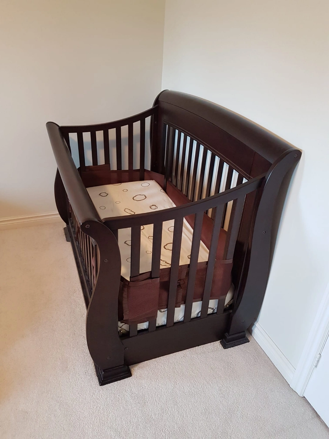 Beautiful dark brown solid wooden crib. Sleigh style crib. Used but in good condition. Includes hypoallergenic mattress, cloth bar guard and fitted sheet. Approximately 5' x 2.5'.