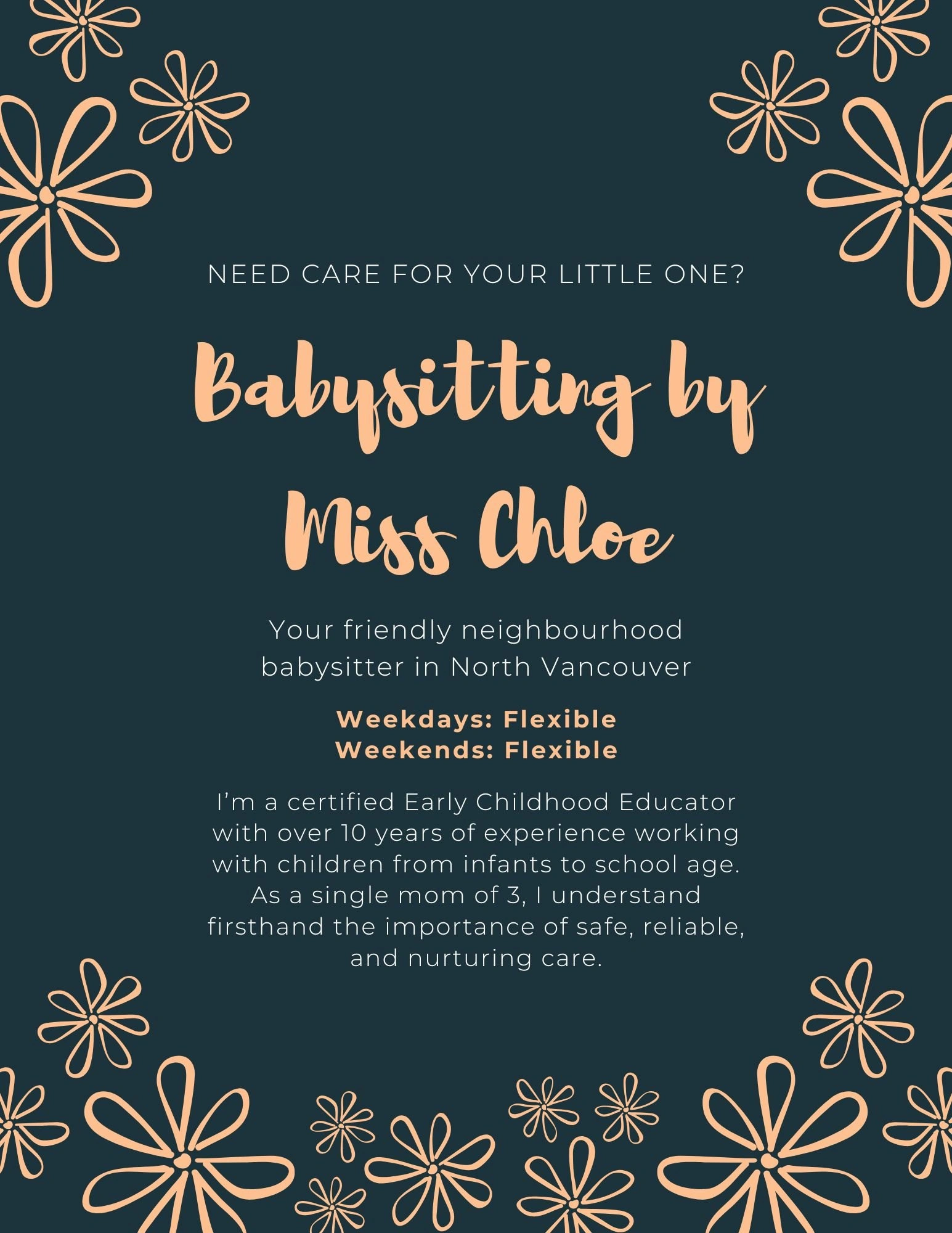 🌟 Babysitting Services Available 🌟 Hi everyone! My name is Miss Chloe, and I’m a certified Early Childhood Educator with over 10 years of experience working with children from infants to school age. As a single mom of 3, I understand firsthand the importance of safe, reliable, and nurturing care. ✨ What I offer: ✔️ 10+ years of experience in childcare and education ✔️ Certified ECE & Infant/Toddler & Special Needs Specialist ✔️ Current Child First Aid & CPR ✔️ Engaging activities, structured routines, and patient, loving care 📍 I prefer to provide care in your home as I have 3 friendly elderly pets at my home. 💲 My rate is $20/hour, but I’m happy to negotiate depending on the length of care needed. If you’re looking for a dependable babysitter who will care for your little ones as if they were my own, please feel free to message me. I’d love to chat and see how I can support your family’s needs! 💕