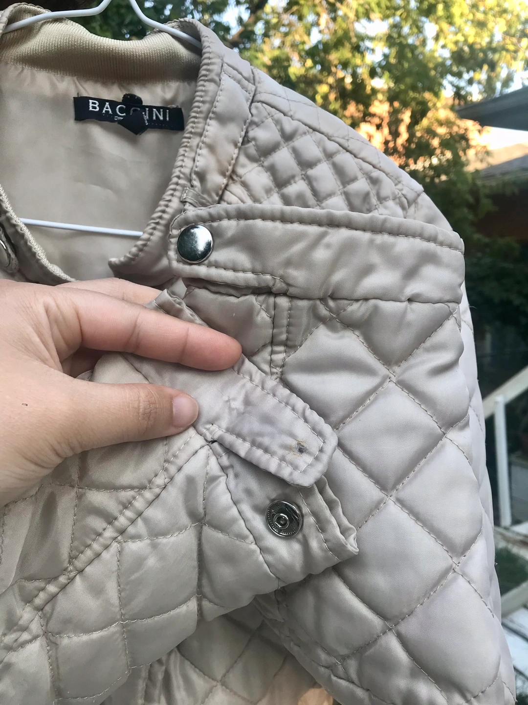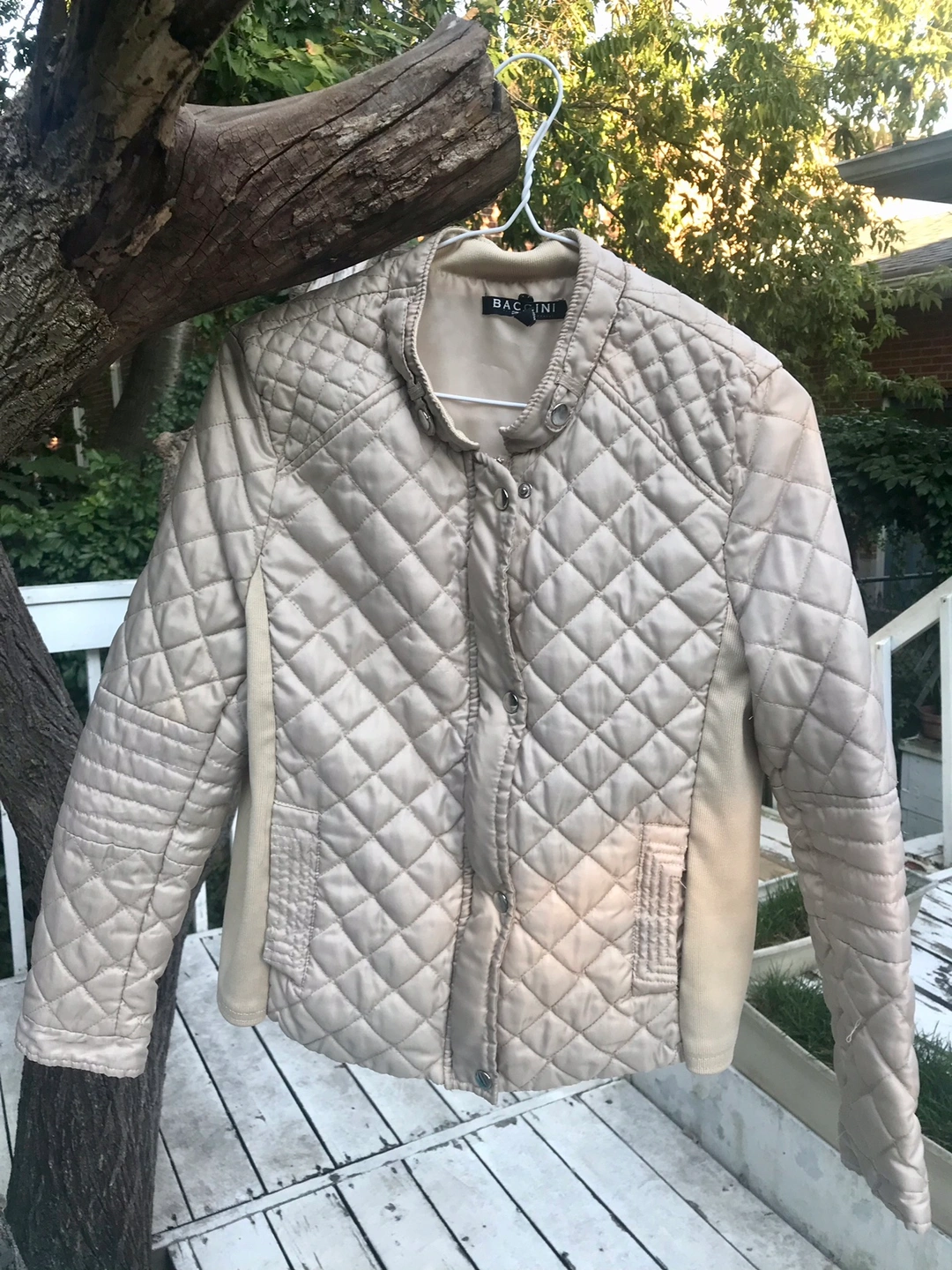 This is a light-weight jacket in a diamond quilted pattern. It has a zipper closure, front pockets and snap buttons. The sleeves are a ribbed material. One missing cuff button. Some loose threads but overall condition still good.