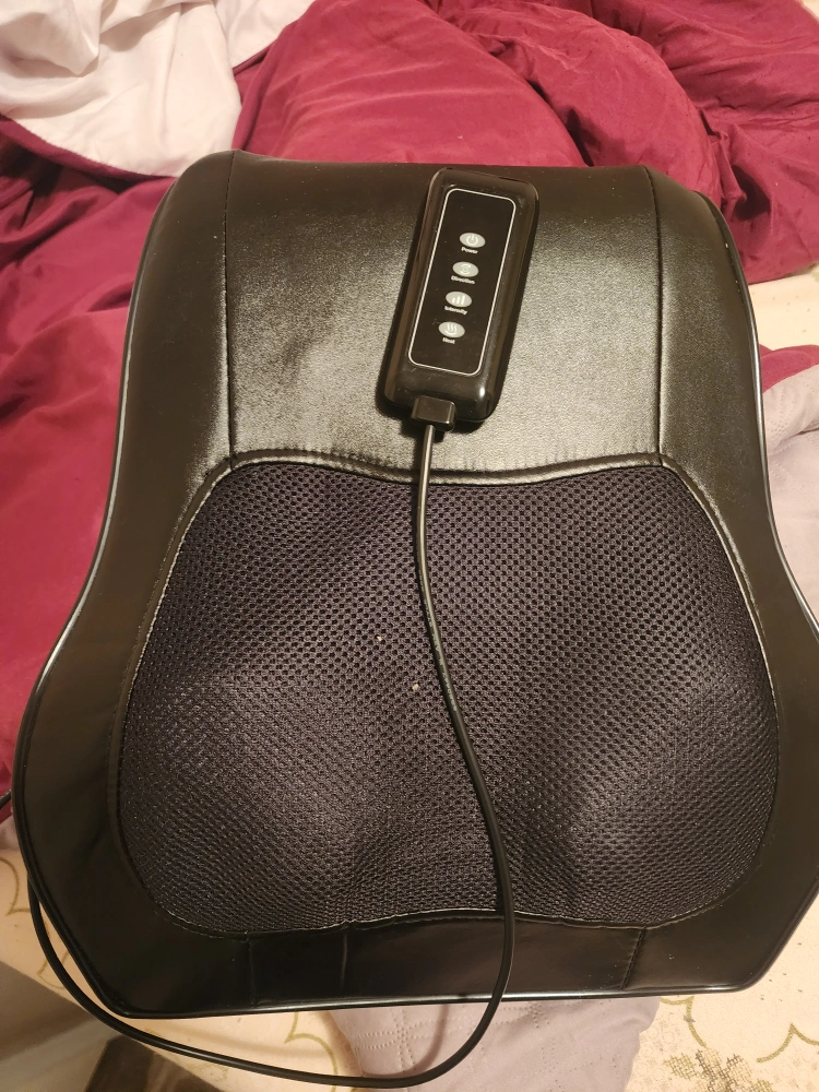 Selling a back massager with heat function. It has a control panel with buttons for power, direction, intensity, and heat. Perfect for relaxing after a long day!