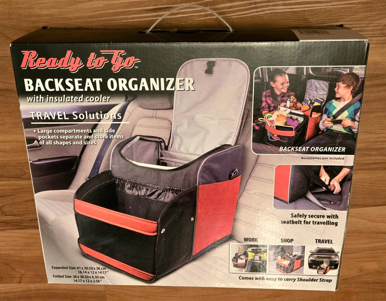 Keep your car organized with this Ready to Go Backseat Organizer! It comes with an insulated cooler, perfect for kids activities, road trips or keeping snacks cold. - Large compartments and side pockets separate and store items of all shapes and sizes - Safely secure with a seatbelt for travelling - Easy to carry with a shoulder strap - Folds flat for easy storage - Removable leakproof vinyl tray for easy cleaning - BPA and Phthalate free Expanded size: 41 x 30.50 x 36 cm Folded size: 36 x 30.50 x 6.50 cm Brand new in the box I have 2 of them. $25 each or $40 for both