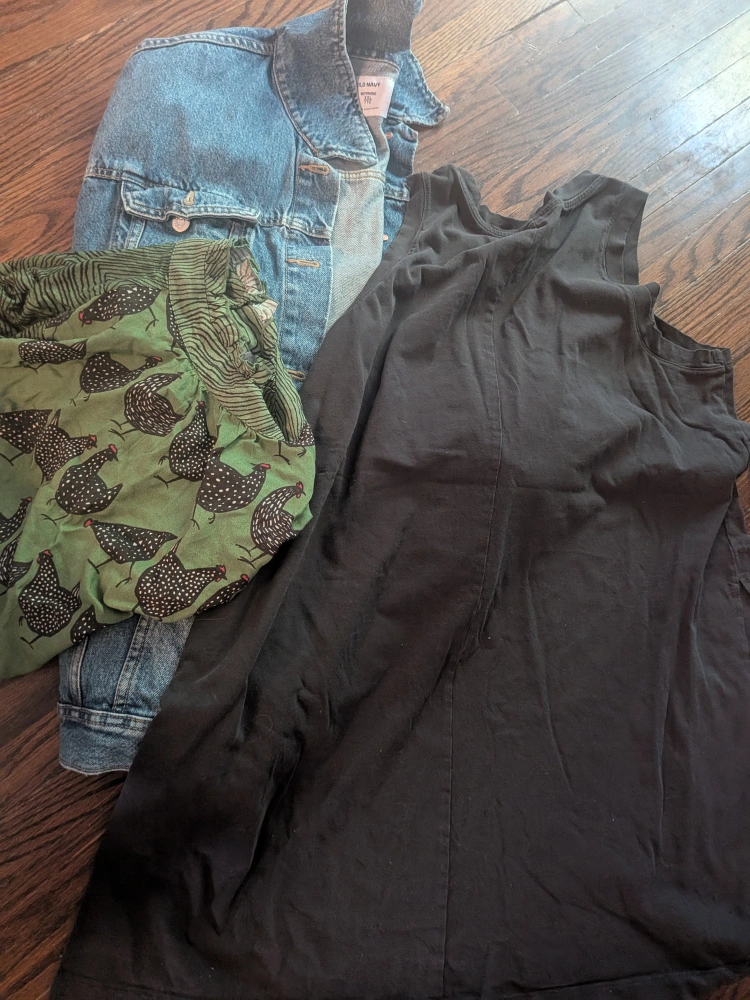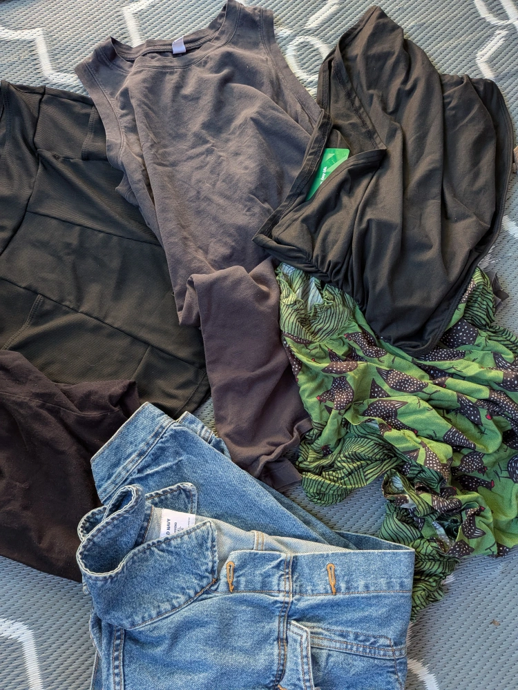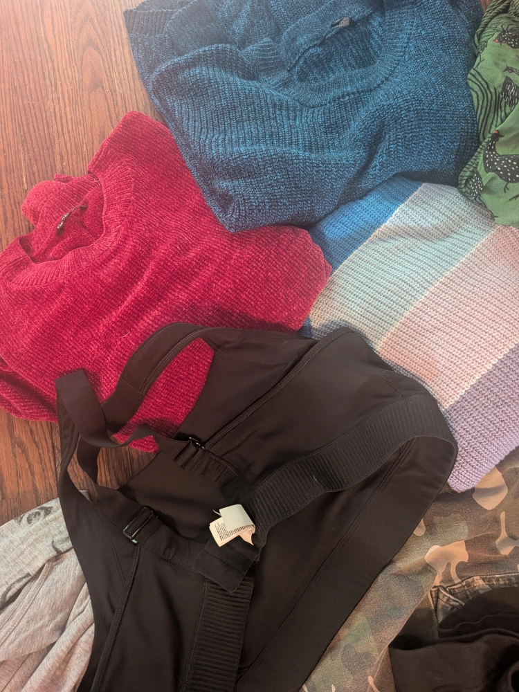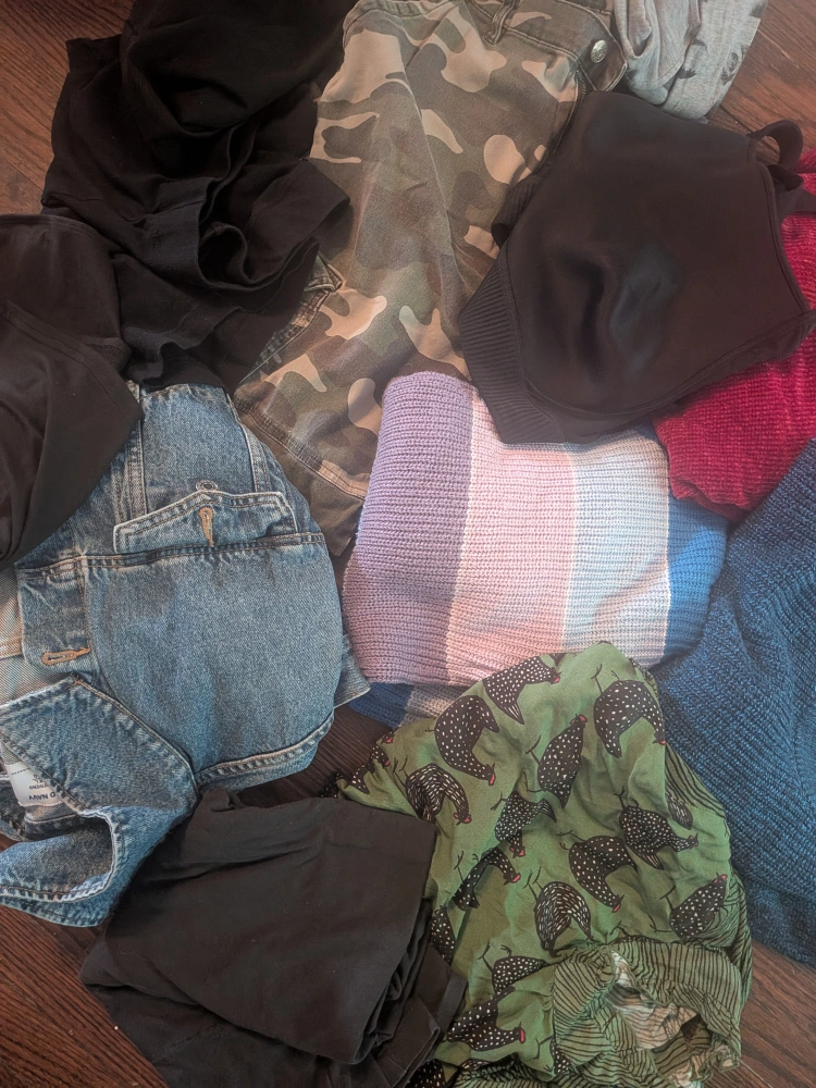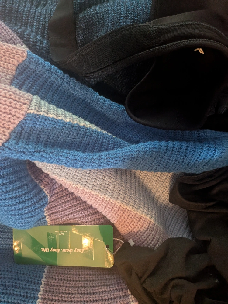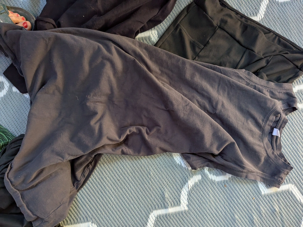 Selling a bag of mixed clothing, including a denim jacket fr lom Old Navy XXL, a grey dress XXL, sweaters large, 2 XL Blk shorts, net Blk top xxl. Blk Sports bra XXL. All in good condition and ready for a new home Cash only, no etransfers Location: Etobicoke. Rathburn Rd and Renforth dr. Etobicoke Olympium nearby