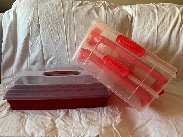 These are used baking containers, perfect for transporting muffins or cupcakes to your next event. There is one container that can hold 24 cupcakes and another container with adjustable dividers, so your baked goods will stay safe and secure! As these containers are used, they have some signs of wear and tear, but they are still fully functional and ready to use. * Holds 24 cupcakes/muffins * Adjustable dividers I am pricing these at $15 due to the better-than-average condition. If the ad is up, it's available!