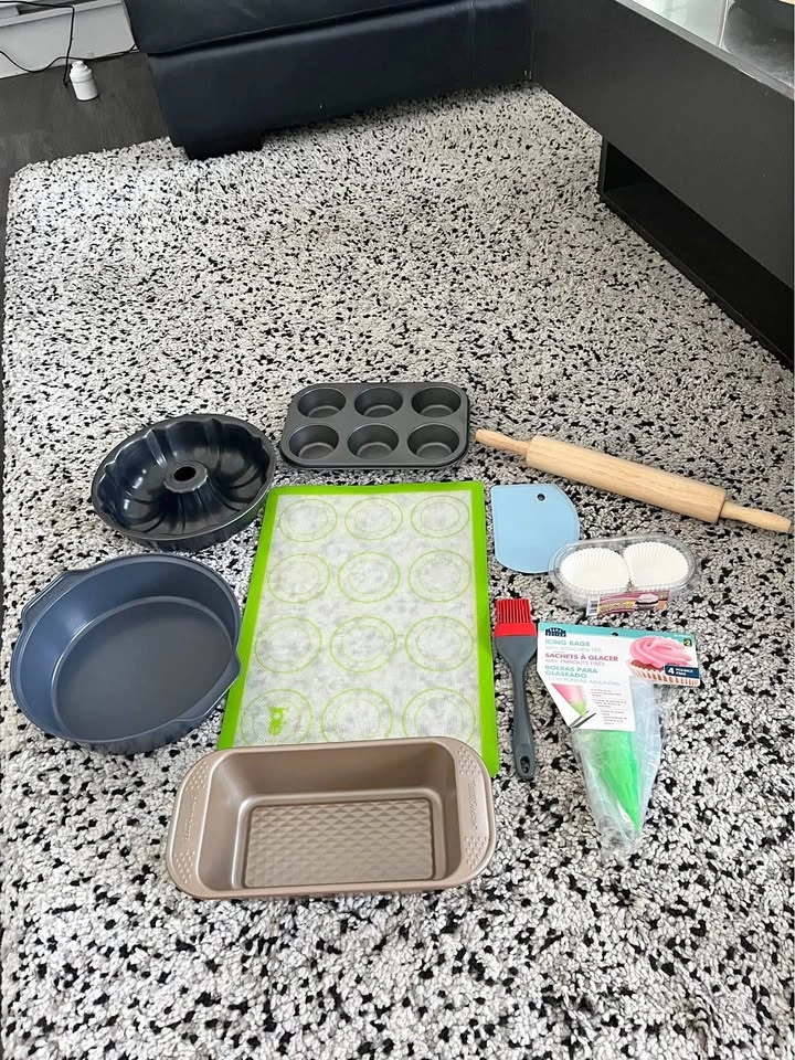 Trays, muffin cups, loaf pan, icing bags, bunt cake pan, non slip baking matt, and rolling pin. Selling because moving.