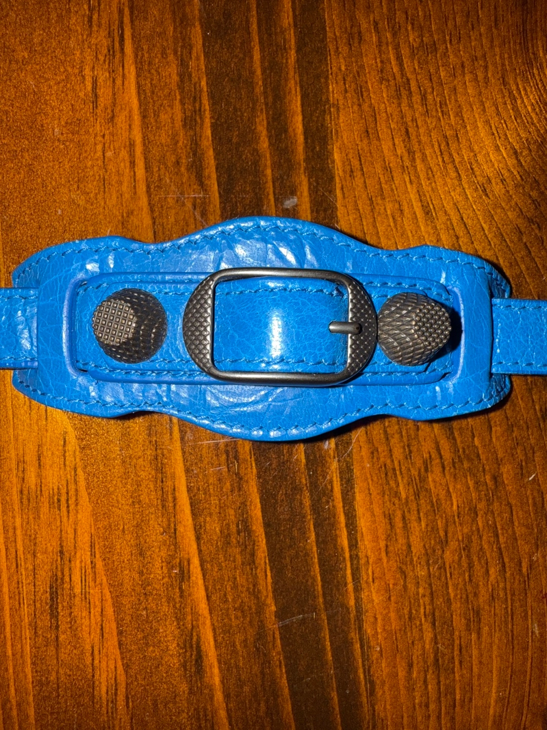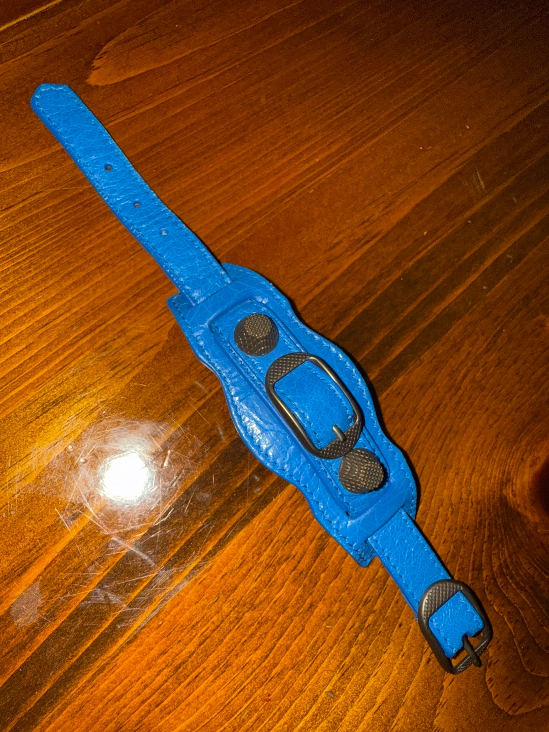 Genuine Balenciaga bracelet. Blue leather. Metal accents. Buckle closure. Pre-owned. Authentic