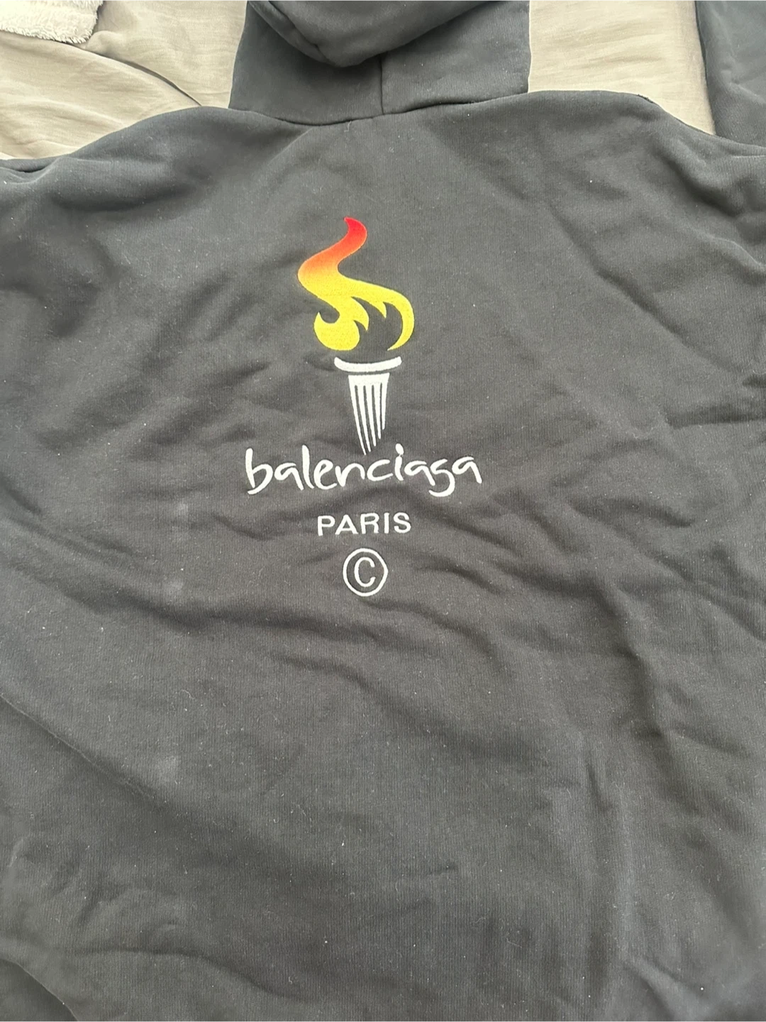 Selling a Balenciaga Paris hoodie in black, size small! It features a cool torch design on the back. The hoodie is in good condition and ready for a new home. Feel free to reach out if you have any questions!