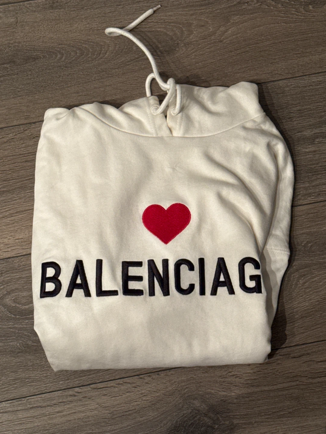 Selling a Balenciaga hoodie in white with a red heart design! It's in great condition and ready for a new home. Perfect for adding a touch of designer style to your wardrobe