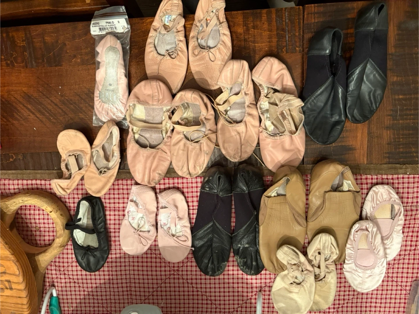 A collection of used ballet shoes in various sizes and styles. Perfect for dance practice or performances! Some are pink and some are black. Please see photos for condition details. DM for price.
