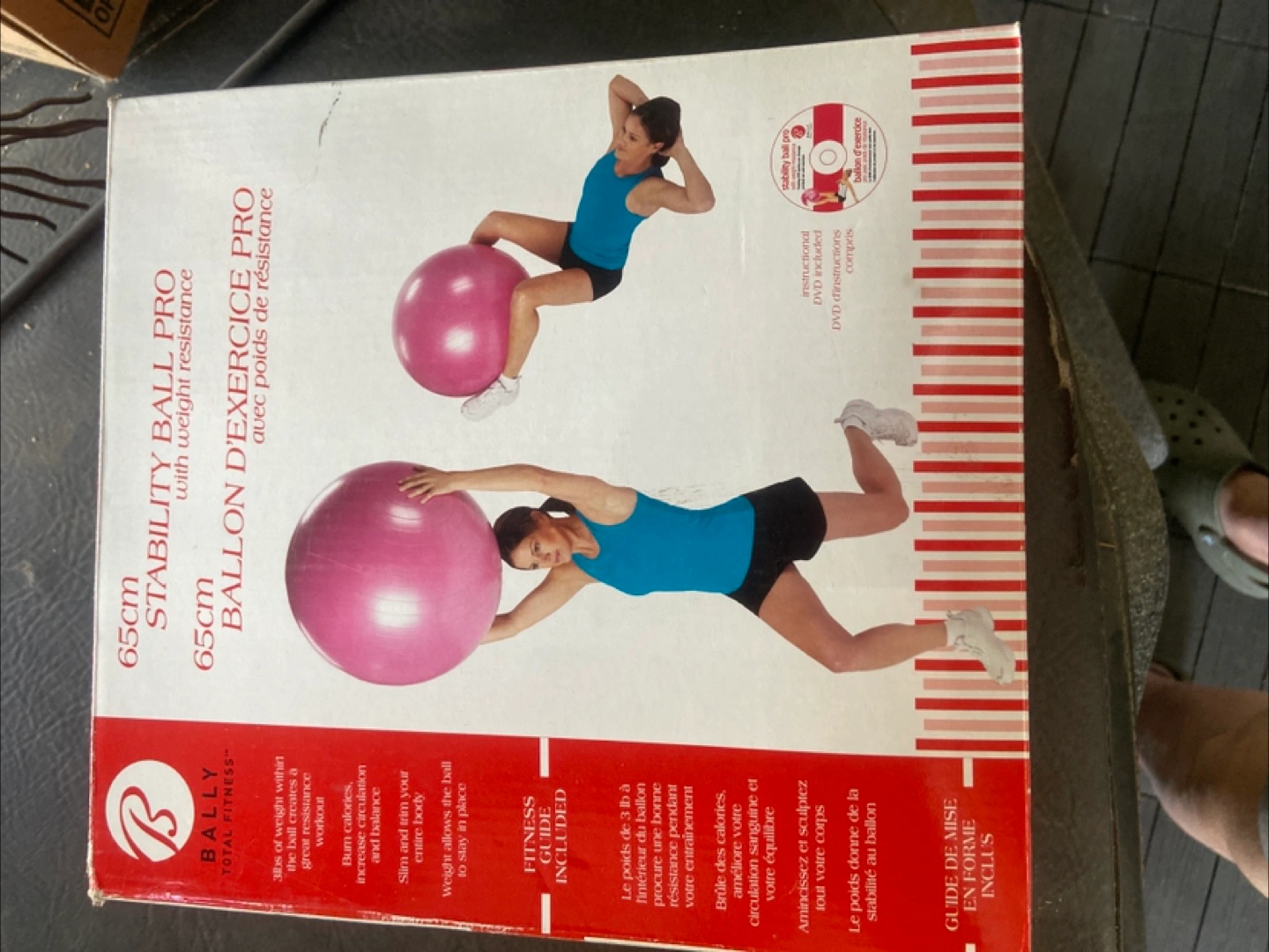 Selling a Bally Total Fitness 65cm Stability Ball Pro! Comes with a fitness guide and instructional DVD. It's designed to help with your workout, burn calories, increase circulation, and improve balance. The ball has about 3lbs of weight inside for added resistance, and helps you slim and trim your entire body