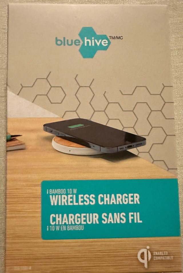 Wireless charger made of bamboo with LED charging light indicator. New in box, never used. Evening and weekend pickup only. Closest major intersection is Hurontario Street and Central Parkway in Mississauga.