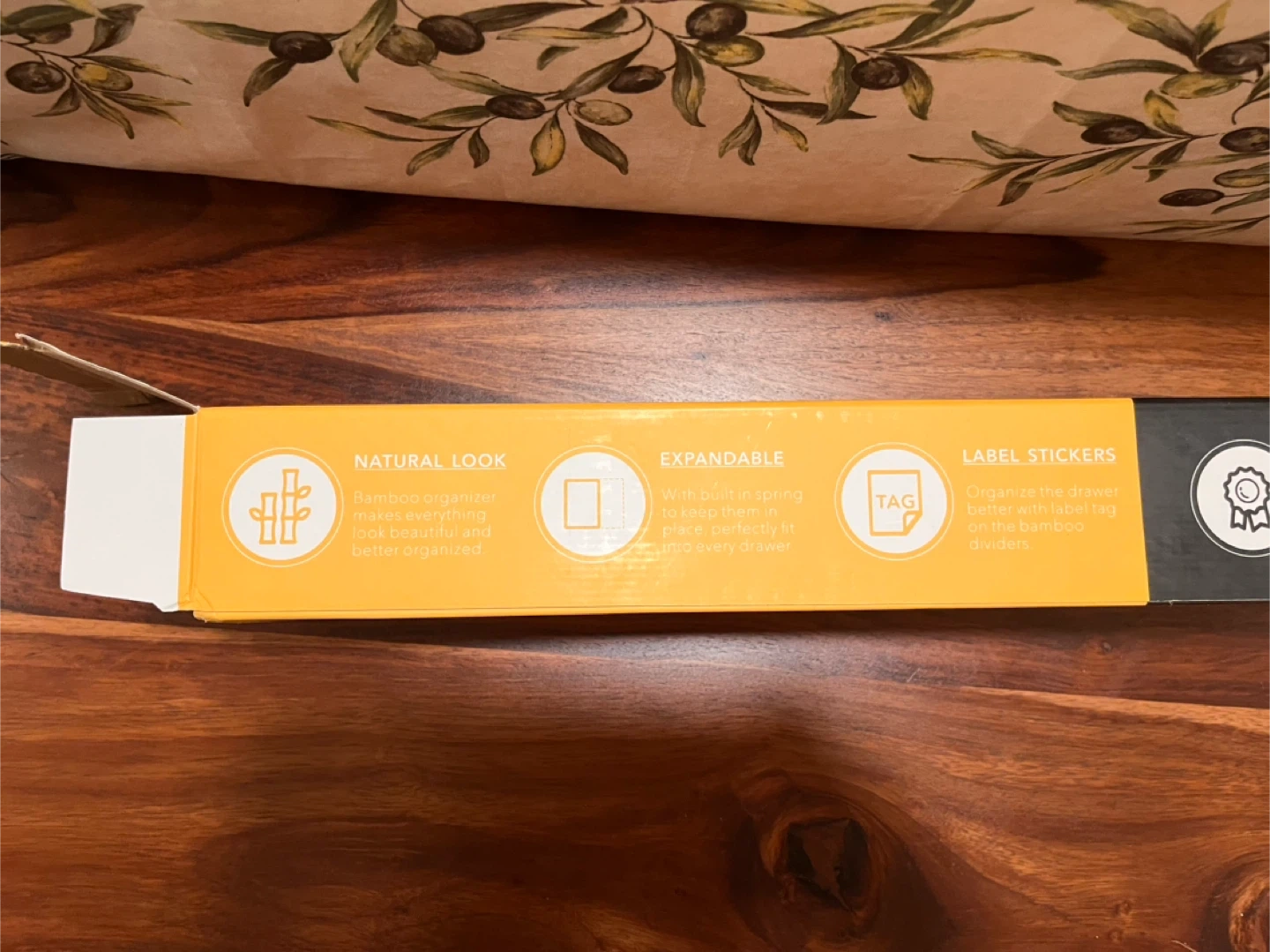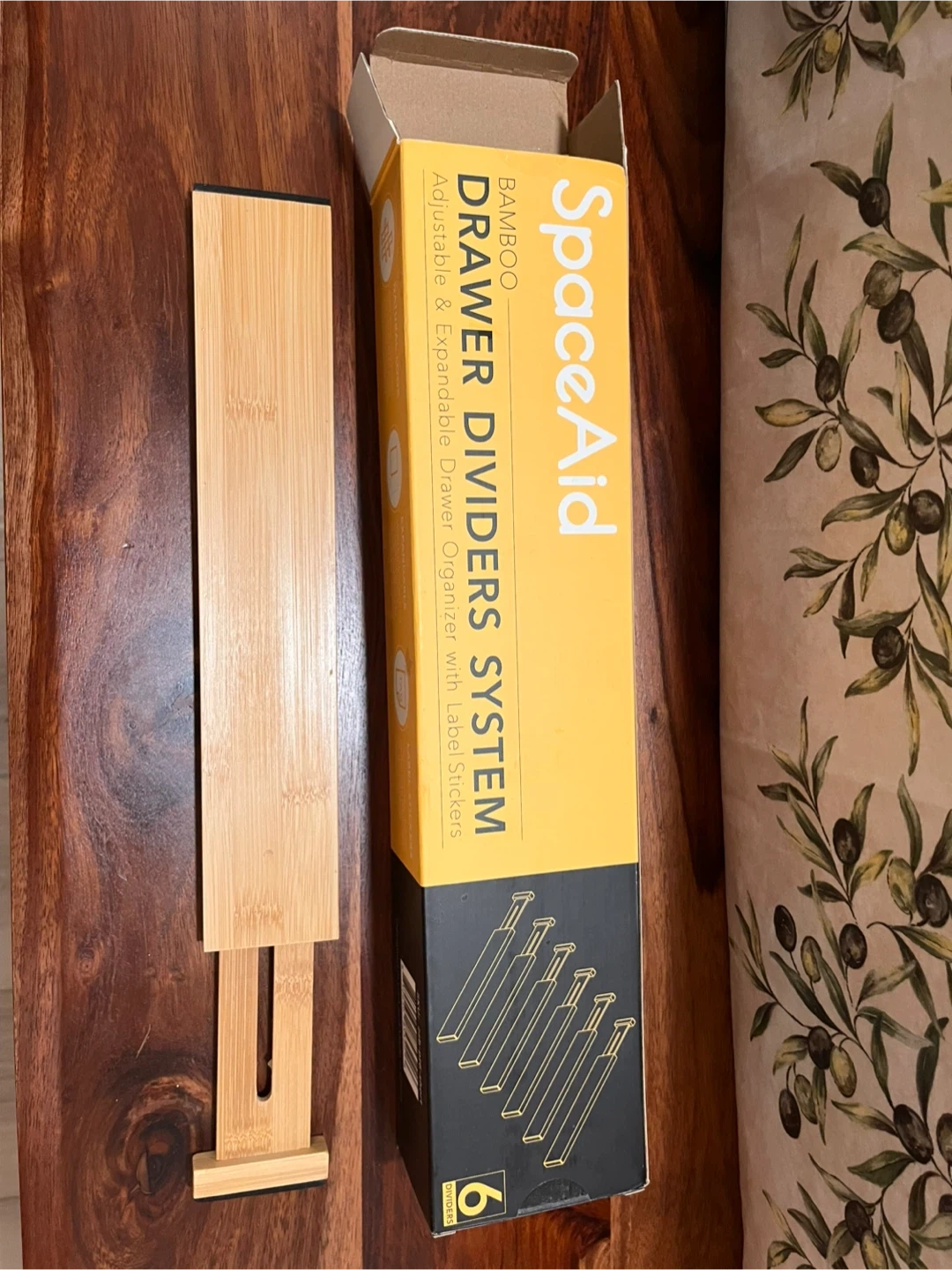 I'm selling a SpaceAid bamboo drawer dividers system. It's an adjustable and expandable drawer organizer with label stickers. - Natural look: Bamboo organizer makes everything look beautiful and better organized - Expandable: With built-in spring to keep them in place, perfectly fit into every drawer