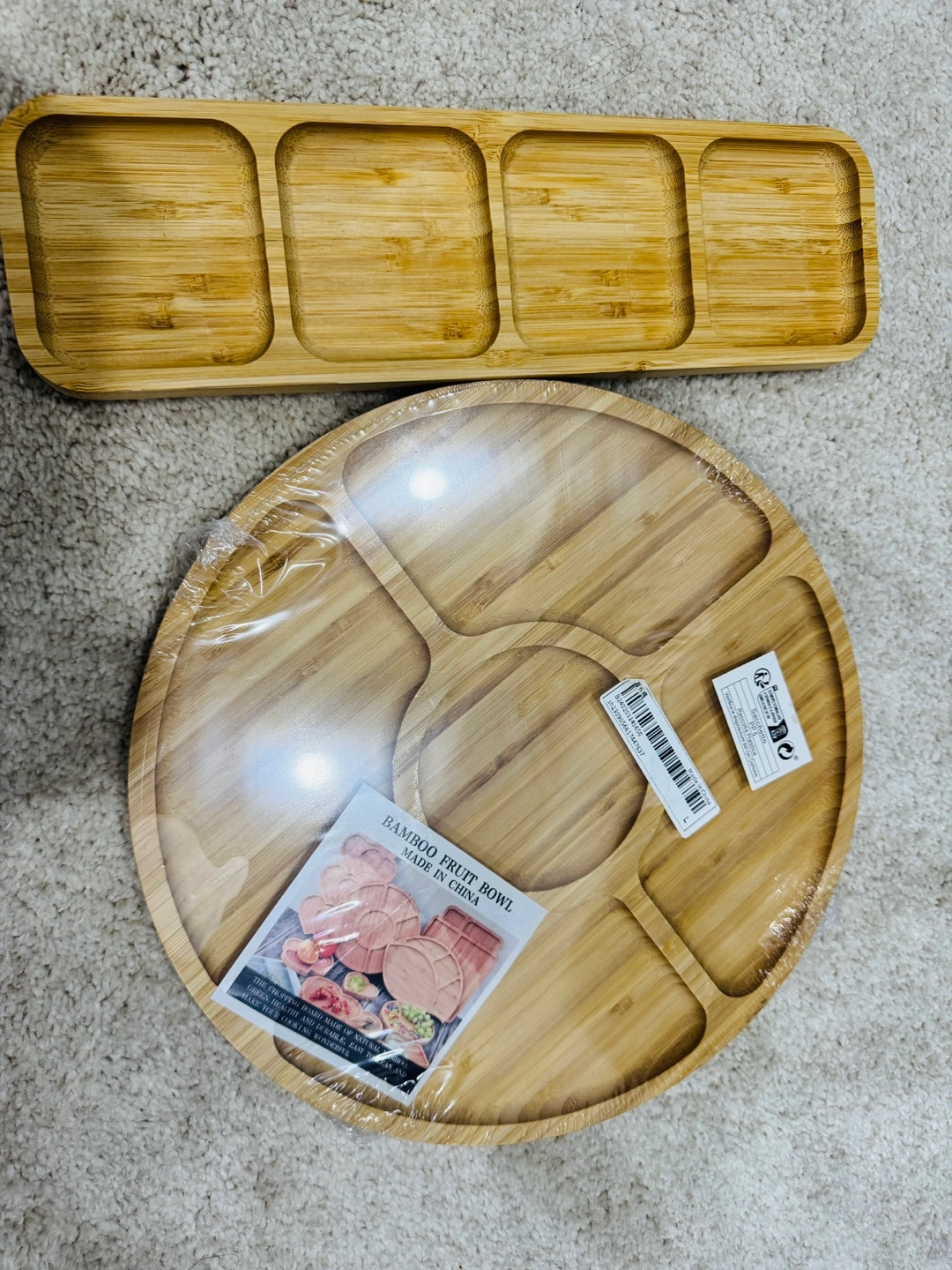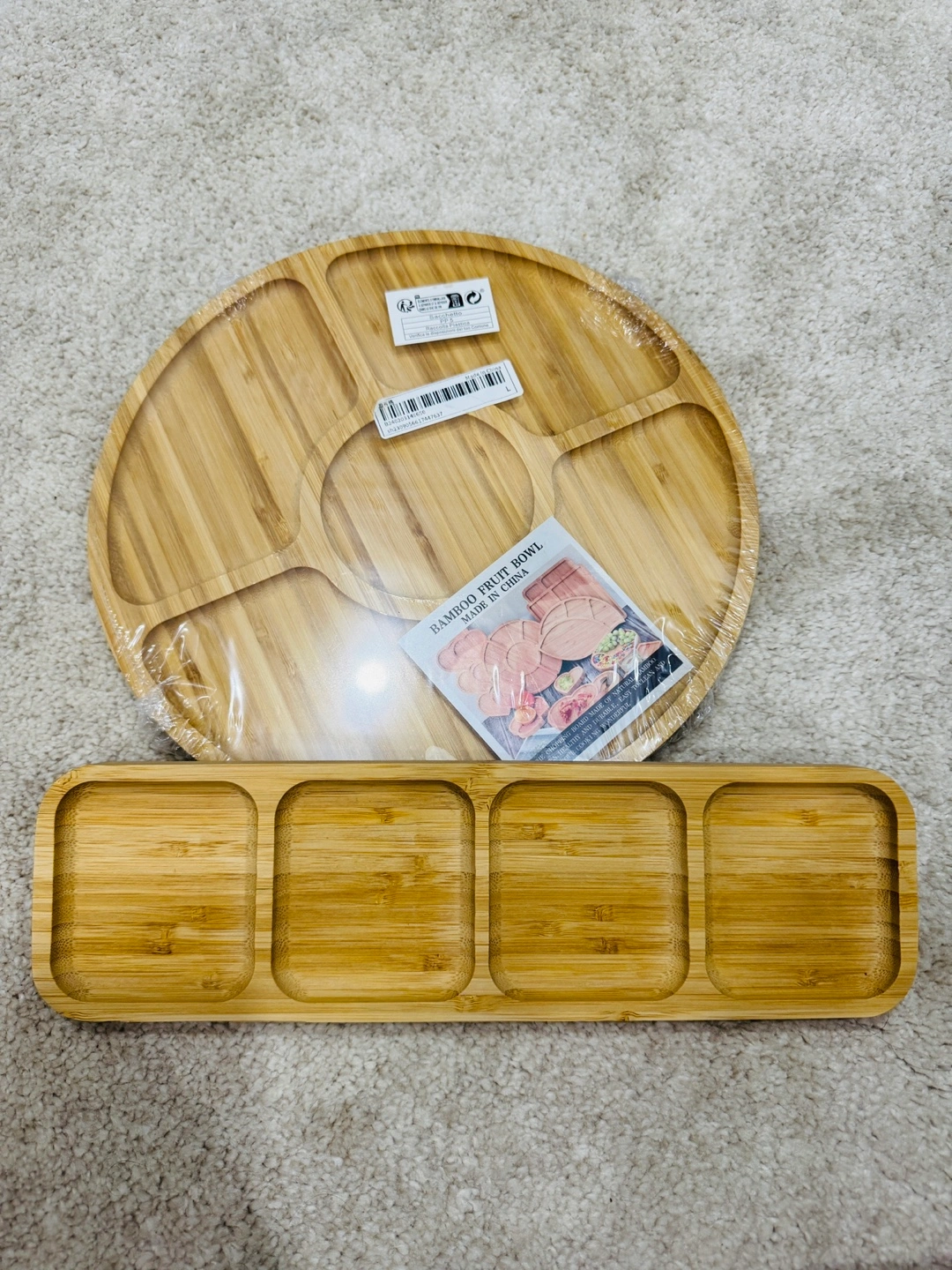 Two bamboo serving trays. One is round with a centre dip and four smaller surrounding dips. The other is rectangular with four evenly spaced compartments.both for very reasonable price, not used both new in package feel free and text for location.