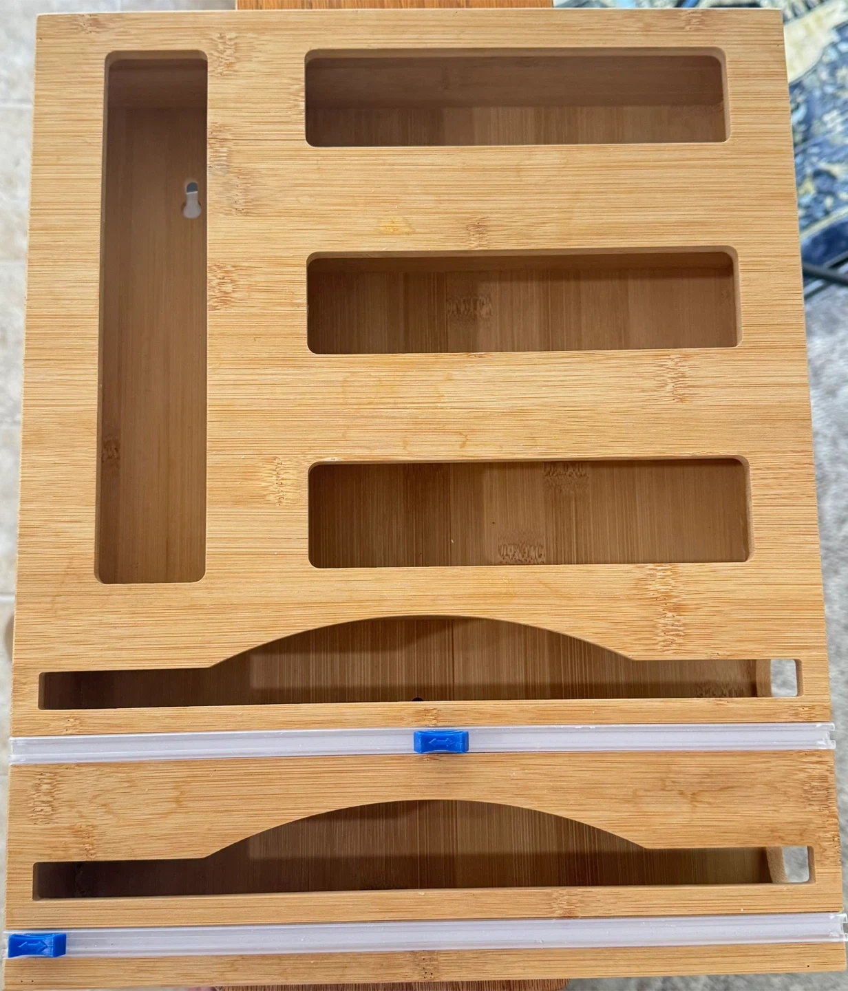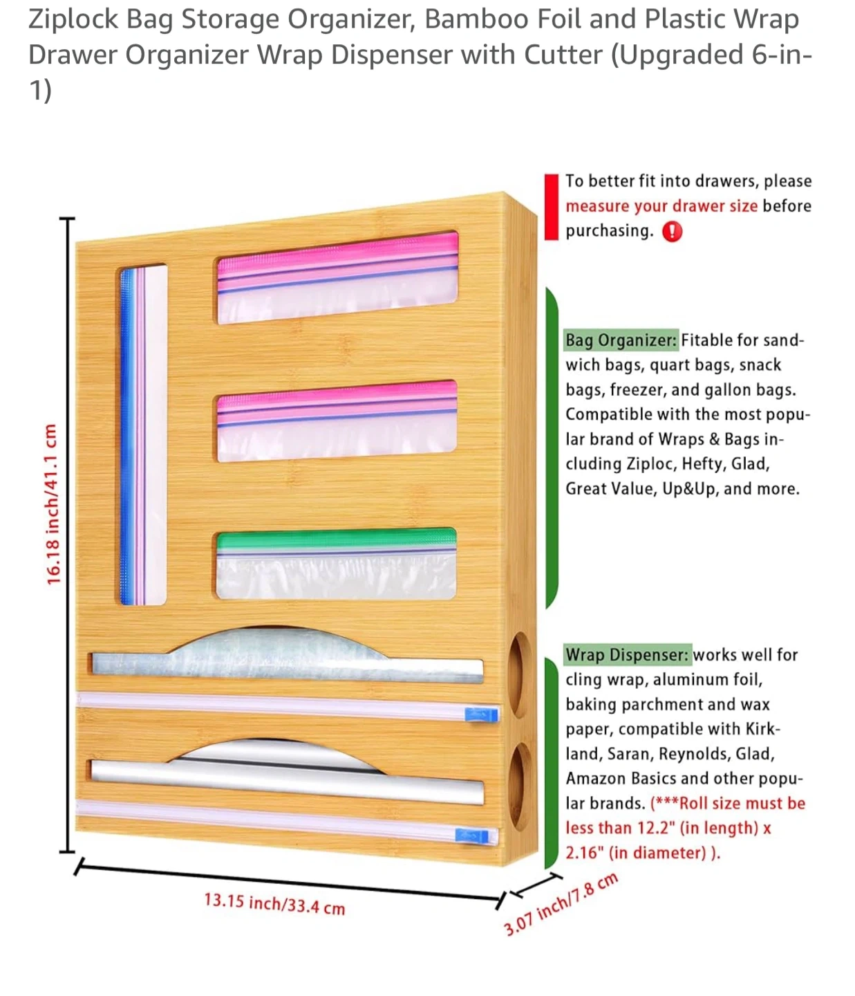 Keep your kitchen drawers tidy with this bamboo organizer! It fits sandwich bags, quart bags, snack bags, freezer, and gallon bags. It's also compatible with most popular brands of wraps and bags, including Ziploc, Hefty, Glad, Great Value, and Up&Up! It also works well for cling wrap, aluminum foil, baking parchment, and wax paper, compatible with Kirkland, Saran, Reynolds, and Glad. Ziplock Bag Storage Organizer, Bamboo Foil and Plastic Wrap Drawer Organizer Wrap Dispenser with Cutter (Upgraded 6-in-1). Can be wall mounted too. Pick up near Grace Hospital.