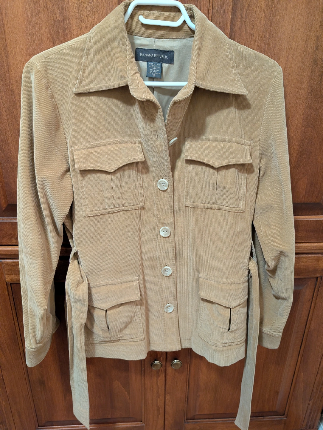 Selling a gently used Banana Republic corduroy jacket in size XS. fits Like a small. it's in great condition (worn once)and features a stylish belted design. The material is 100% cotton with a rayon lining. Perfect for adding a touch of vintage charm to your wardrobe! Pick up in Kitsilano.