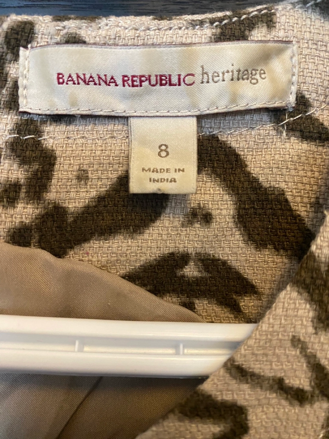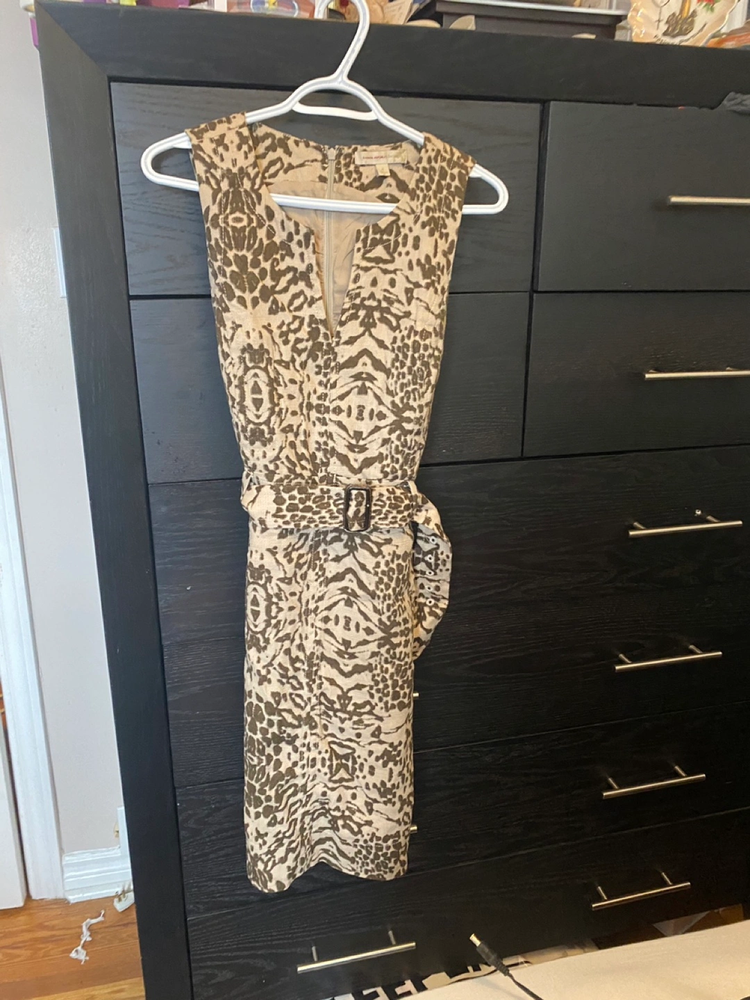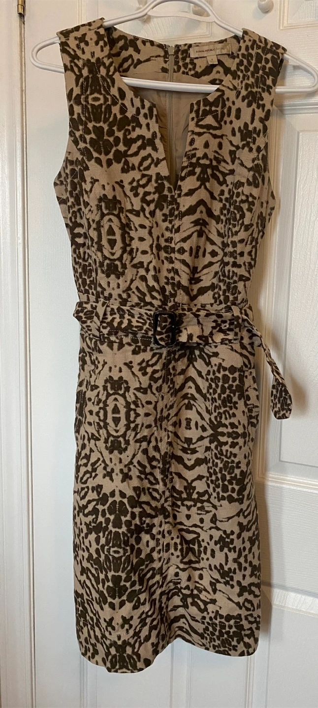 Beautiful Banana Republic Heritage dress. Size 8. Animal print. Belted waist. Sleeveless. V-neck.