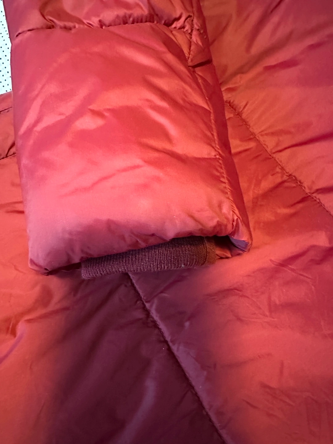 Burgundy puffer jacket. Asymmetrical zip closure. High collar. Ribbed cuffs. Excellent condition. It also fits XS-S clean, no ripping or stain