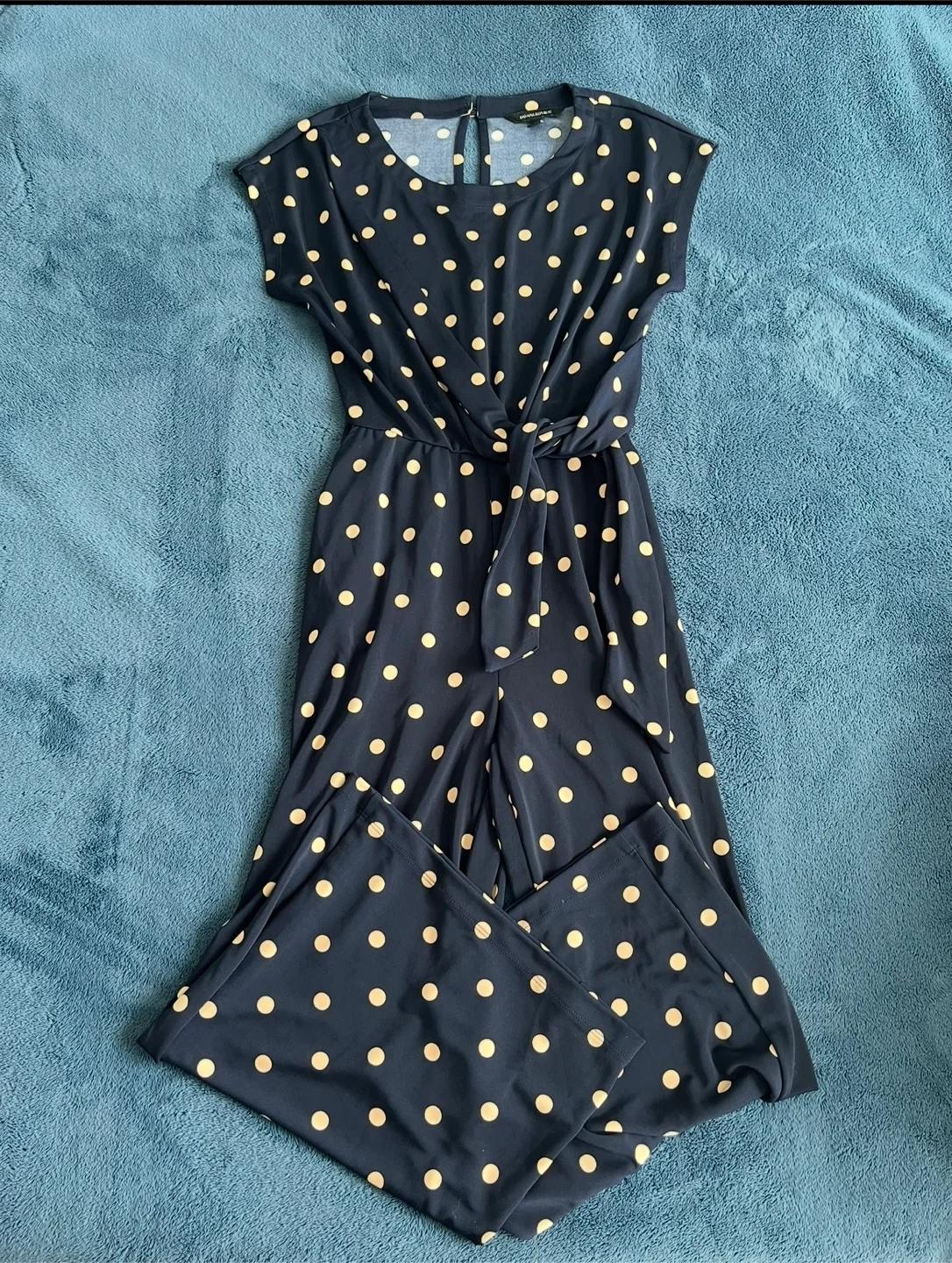 This is a Banana Republic jumpsuit with a fun polka dot pattern! It's in great condition and features a flattering tie at the waist. Perfect for a casual day out or dressing up for an evening event
