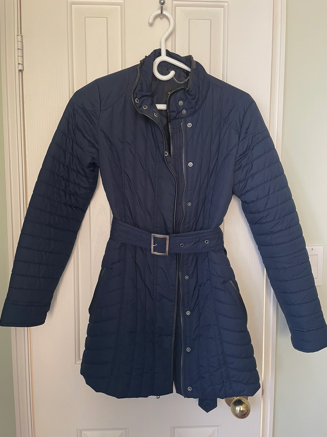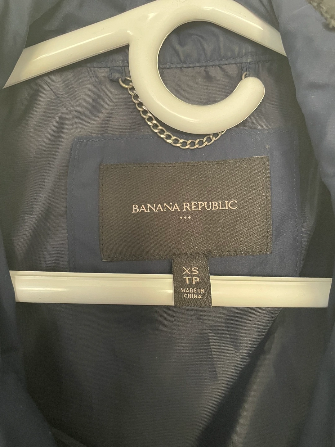 Navy mid-length fall coat Comes with a belt or can be worn without Zipper and button closure Deep pockets Slight fraying on collar trim Otherwise in great condition Banana Republic size XS