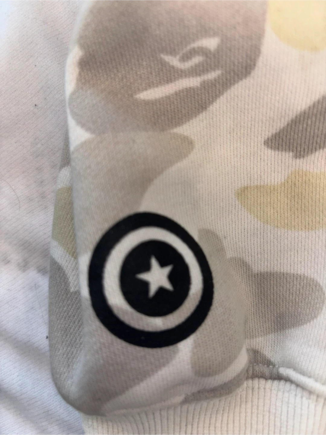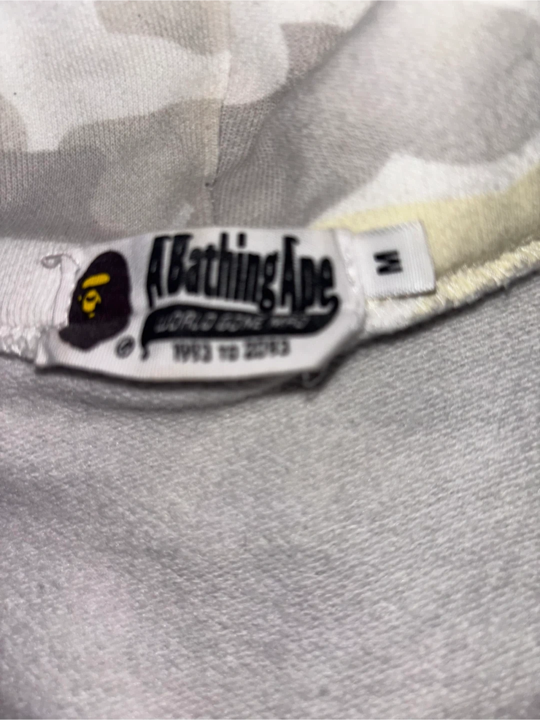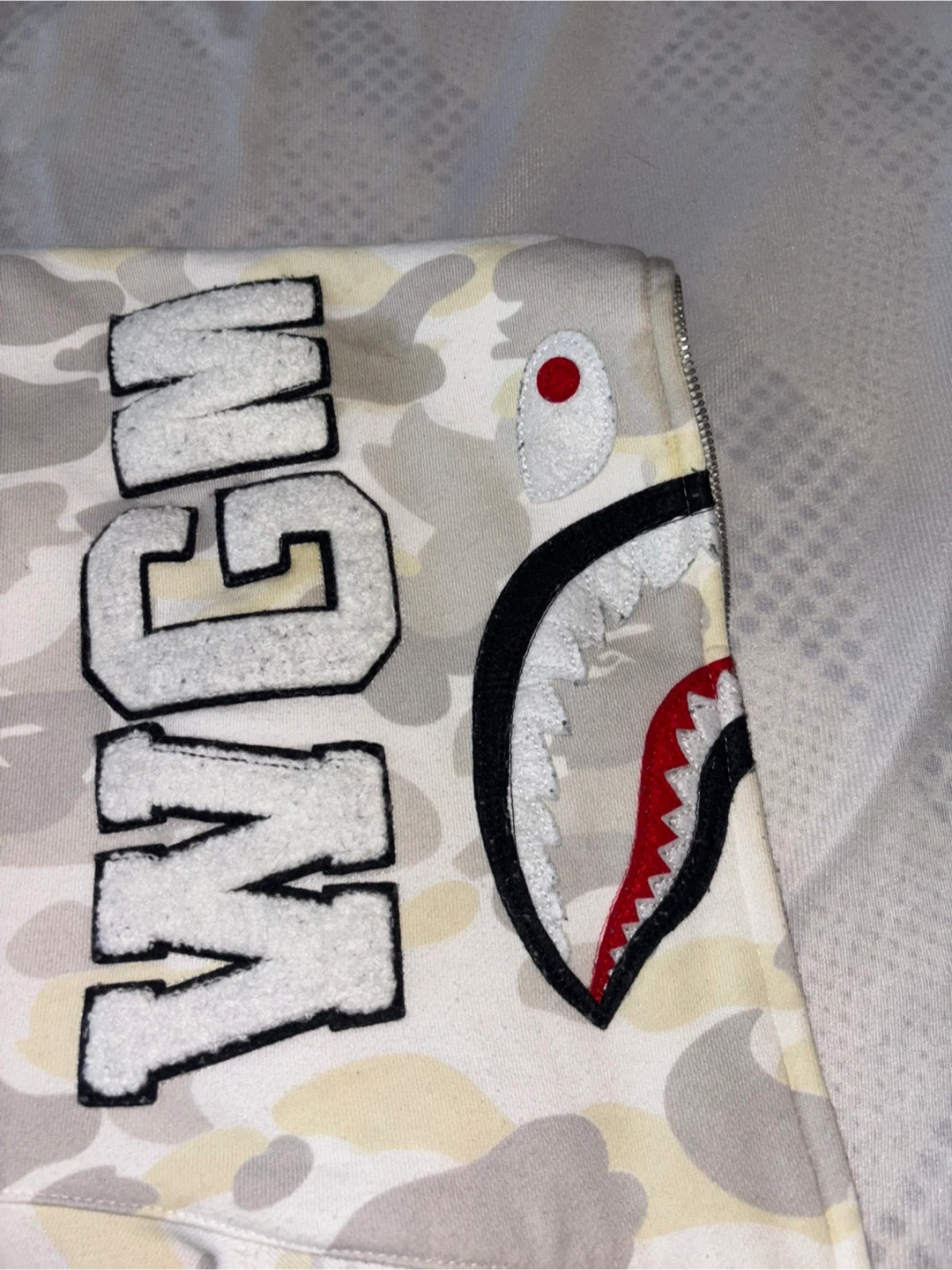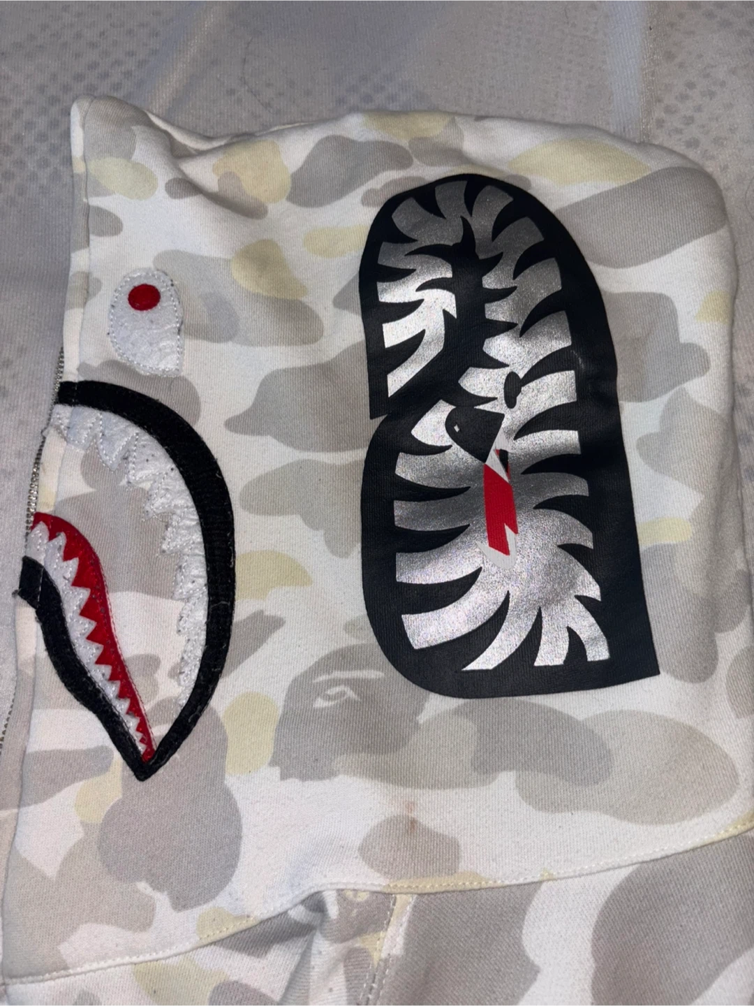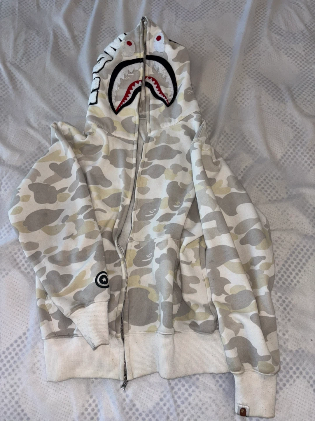 Selling a BAPE (A Bathing Ape) camo shark hoodie! It's in great condition and features the iconic shark design on the hood and a camo pattern throughout. Perfect for adding a unique touch to your wardrobe!