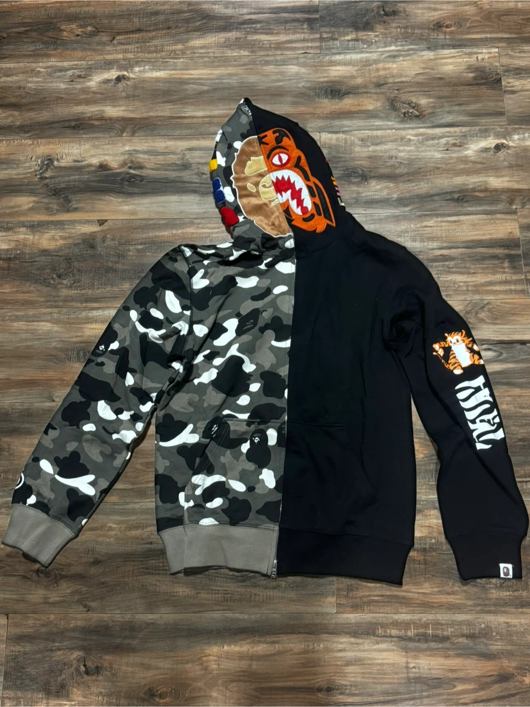 Selling a BAPE Funthera Militia hoodie! It's a unique half camo design, with the iconic BAPE tiger graphic on the hood. The other half is solid black with a tiger graphic on the sleeve. Great for adding a statement piece to your wardrobe!