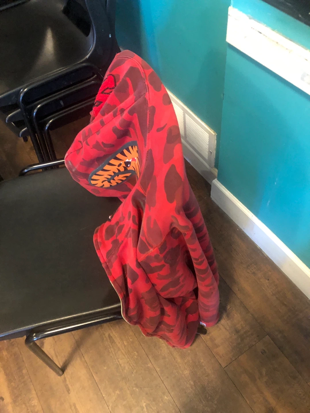 Selling a BAPE (A Bathing Ape) full zip hoodie! It features a red camo pattern with the iconic shark design on the hood. It's in great condition and ready for a new home