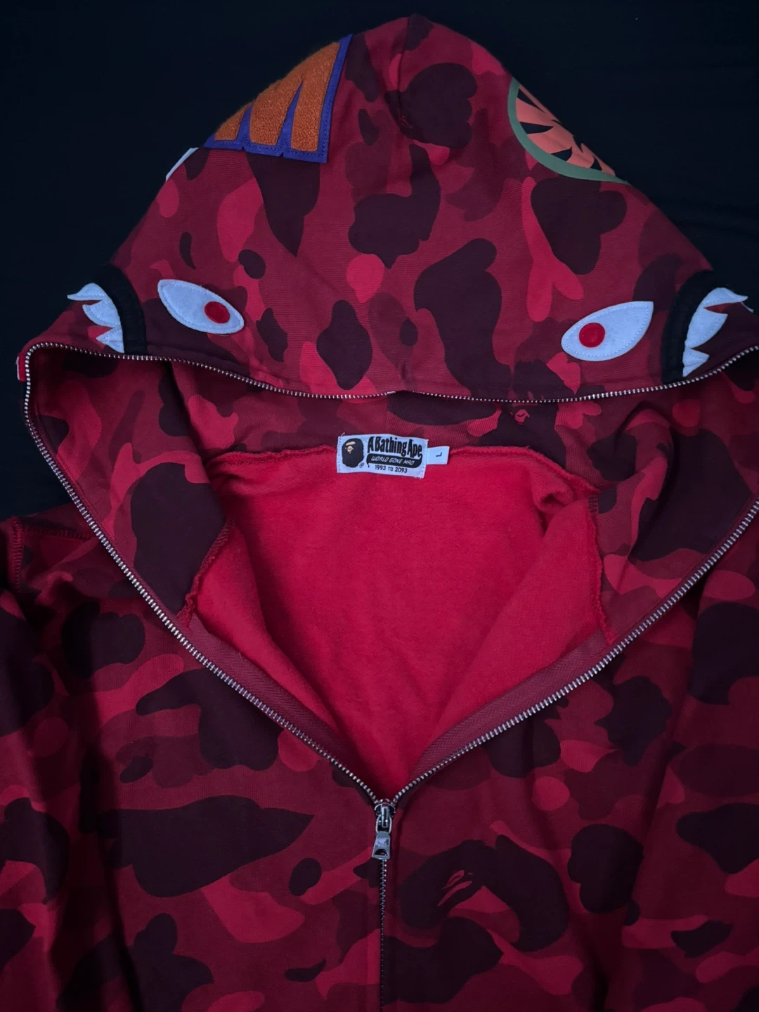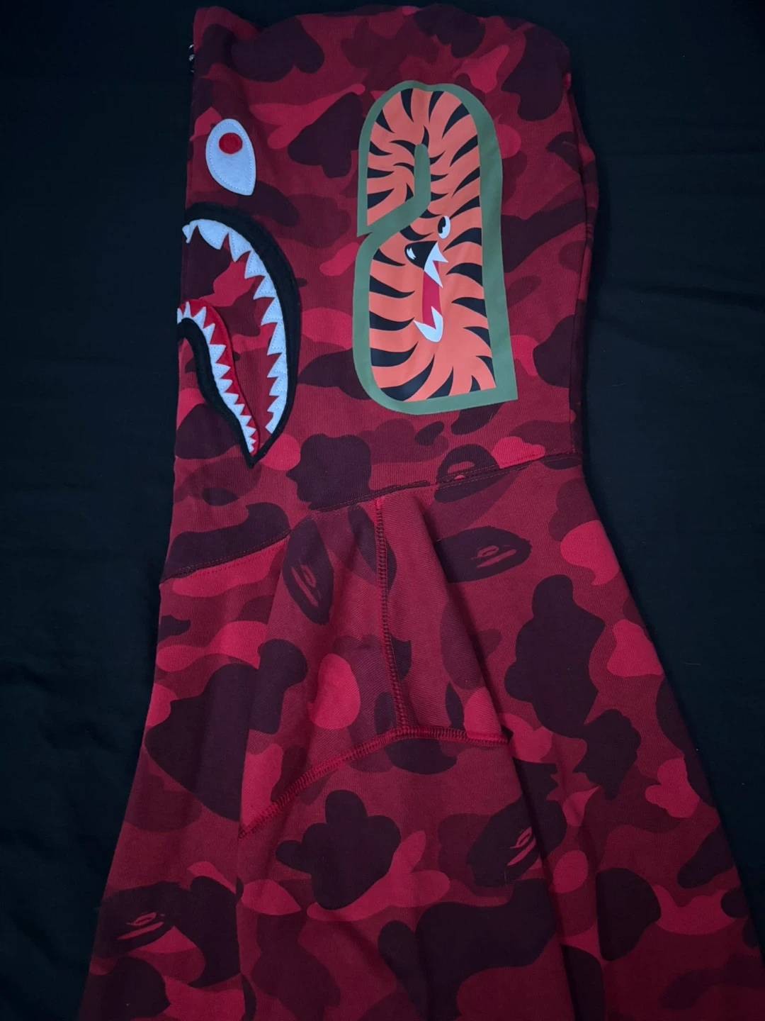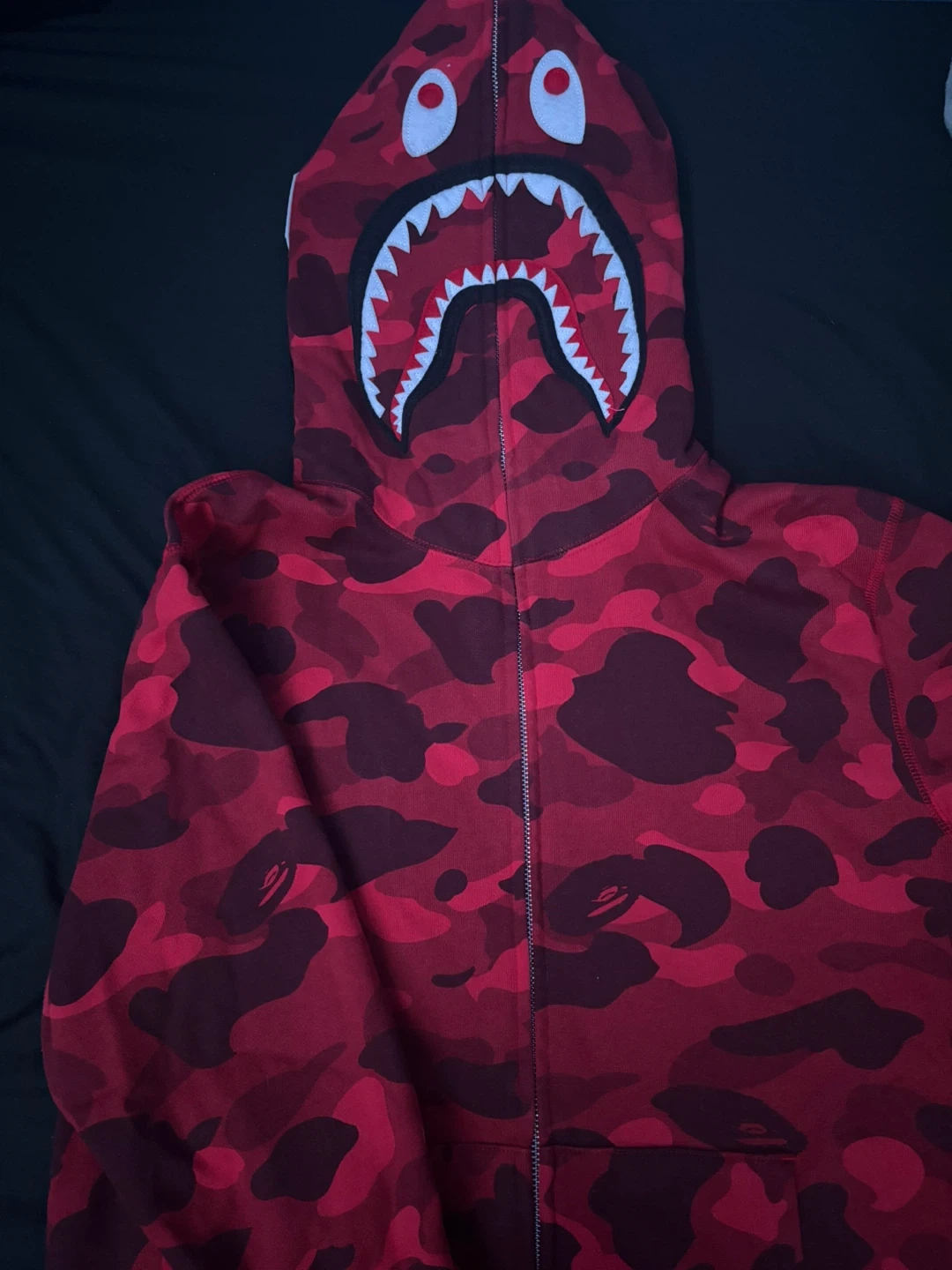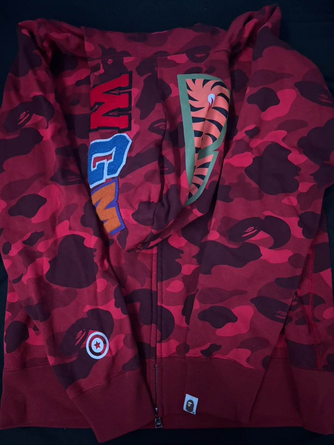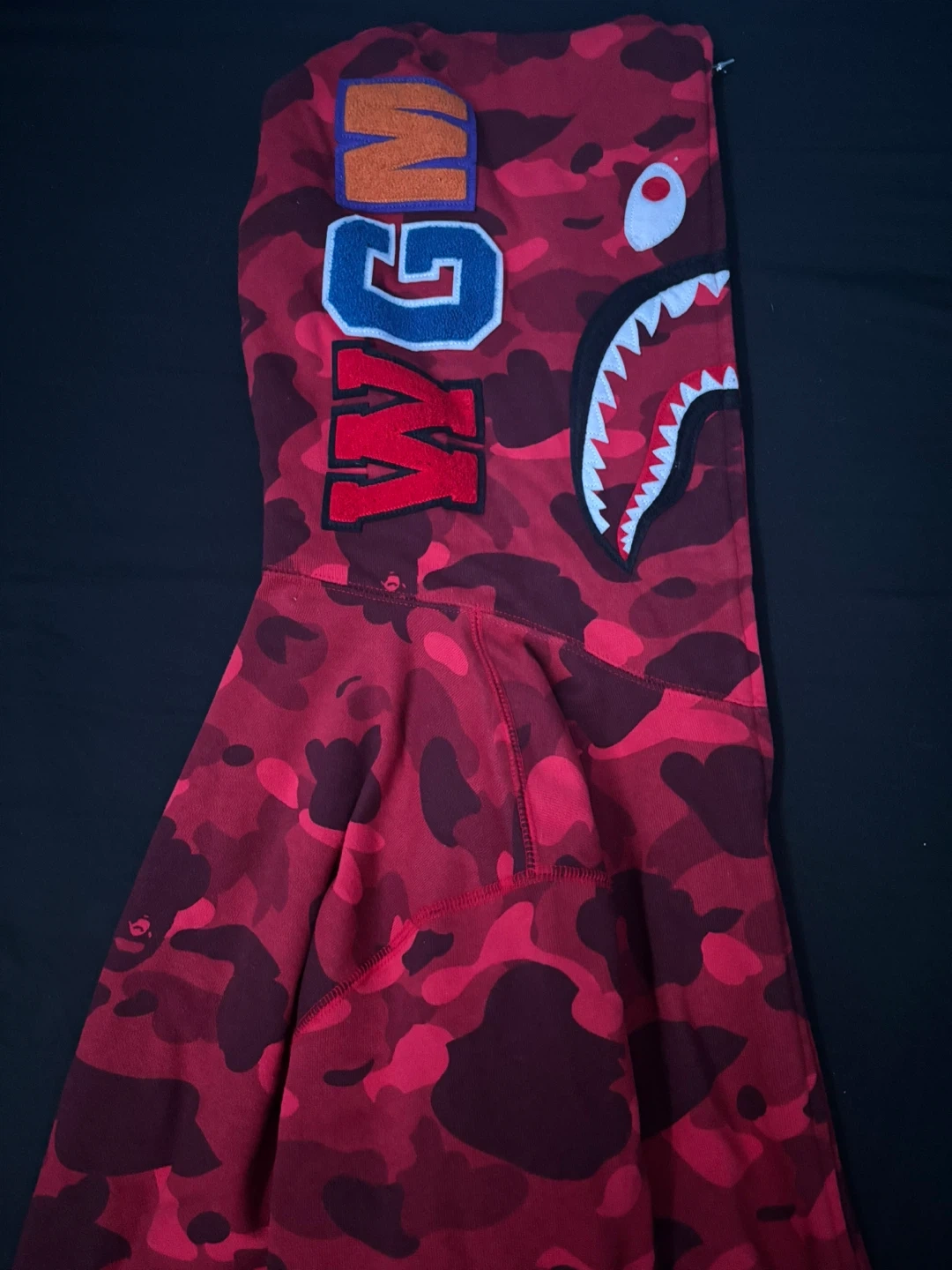 Selling a BAPE (A Bathing Ape) full zip hoodie in red camo. Size is Large! Features the iconic shark design on the hood and 'WGM' lettering. Great for streetwear enthusiasts! Never worn - Good Condition! Price is negotiable!