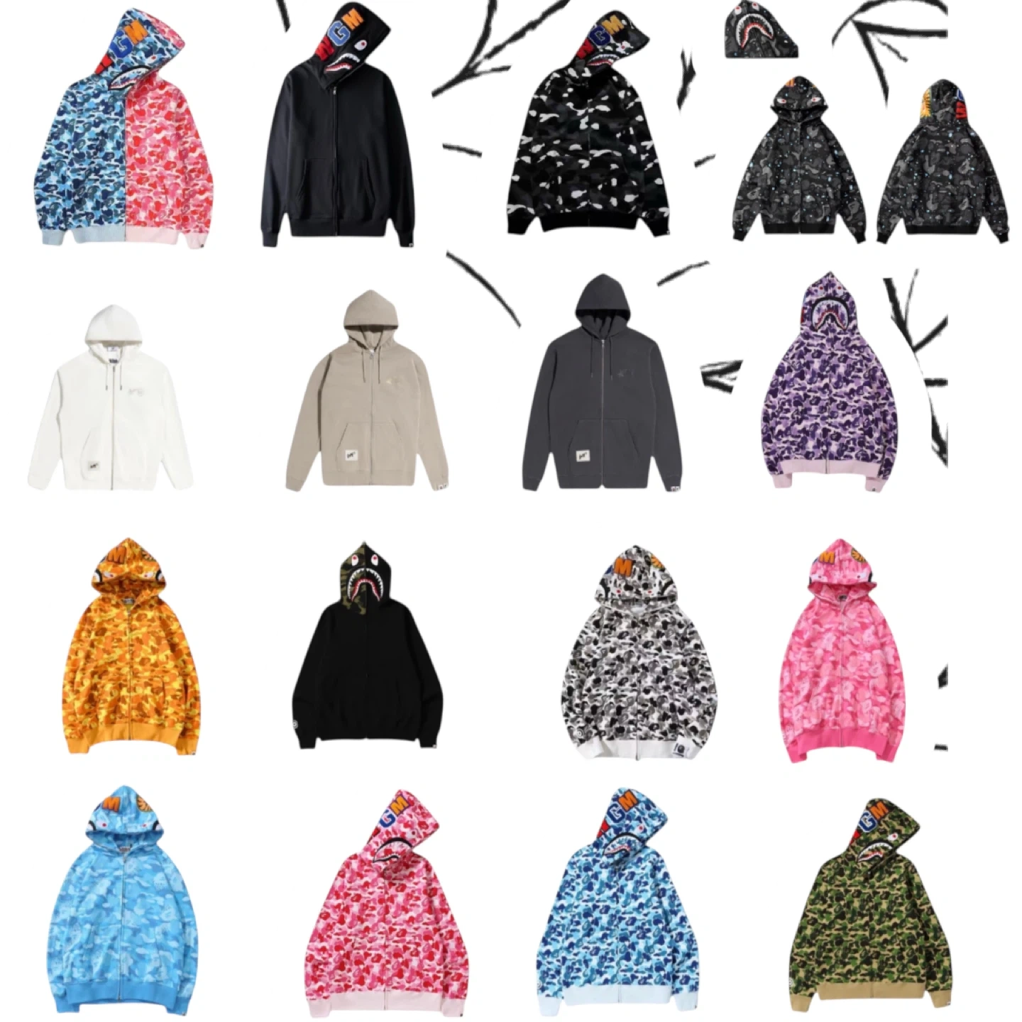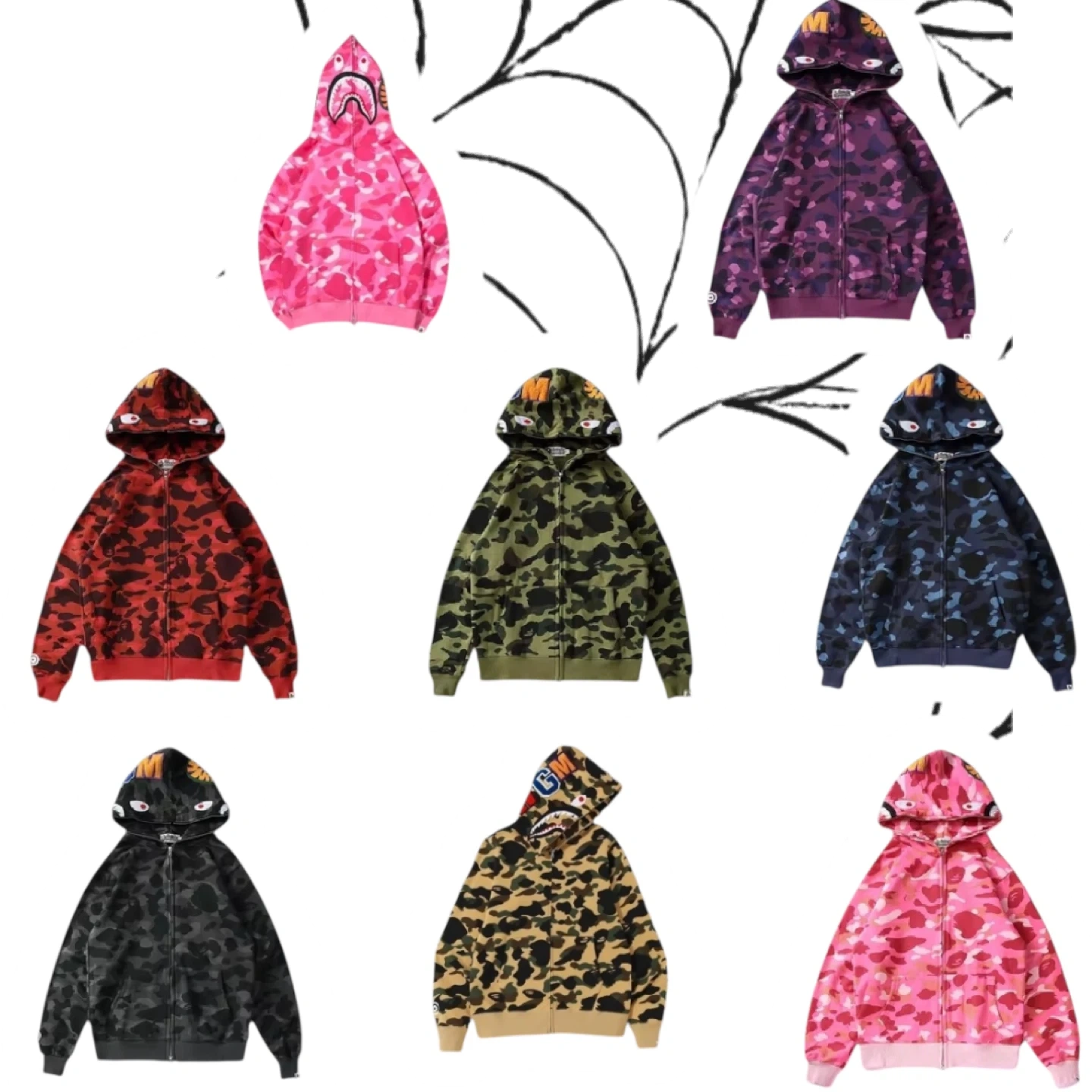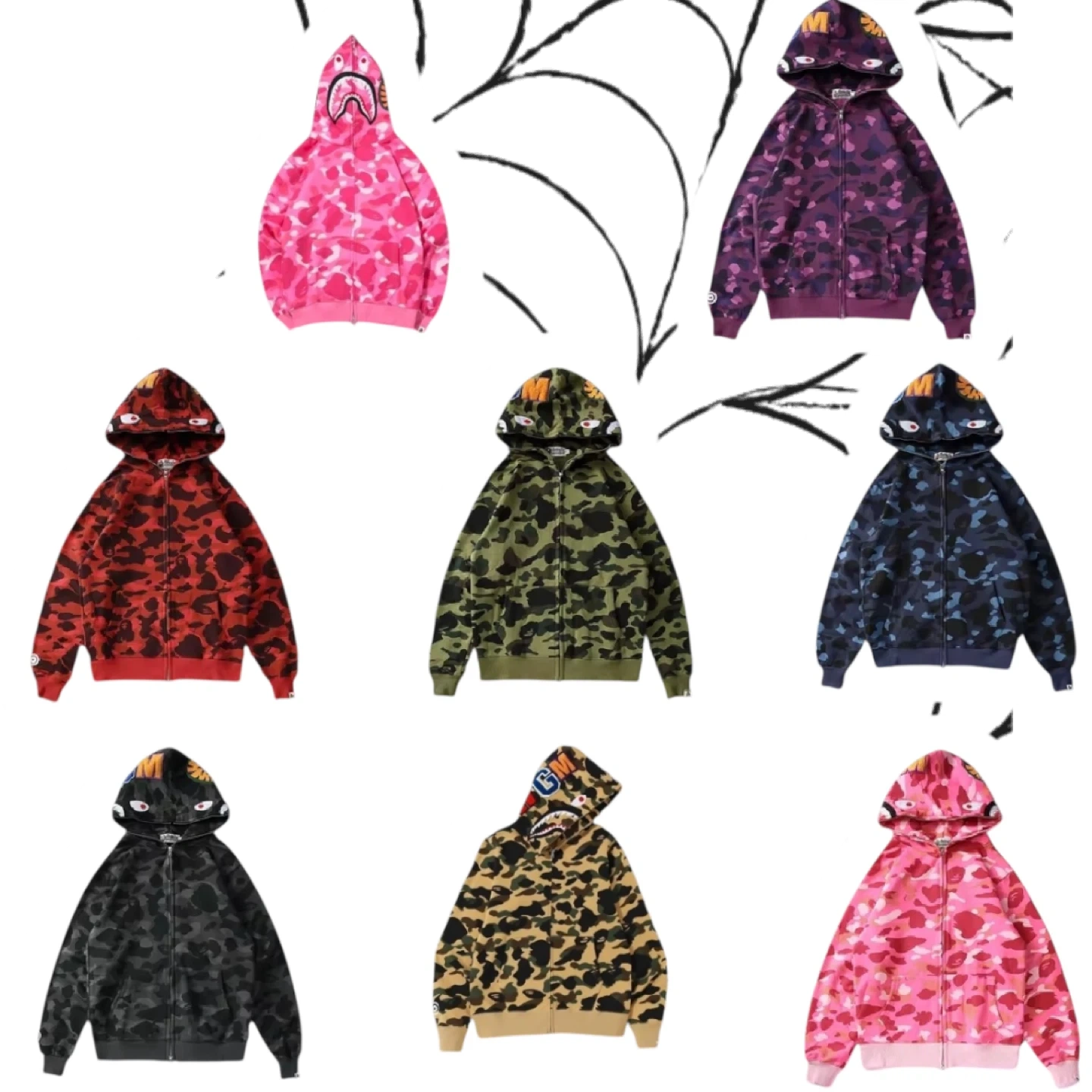 A selection of BAPE shark hoodies in various colours and patterns. Also includes Essentials brand clothing like t-shirts and pants. Great for streetwear enthusiasts!