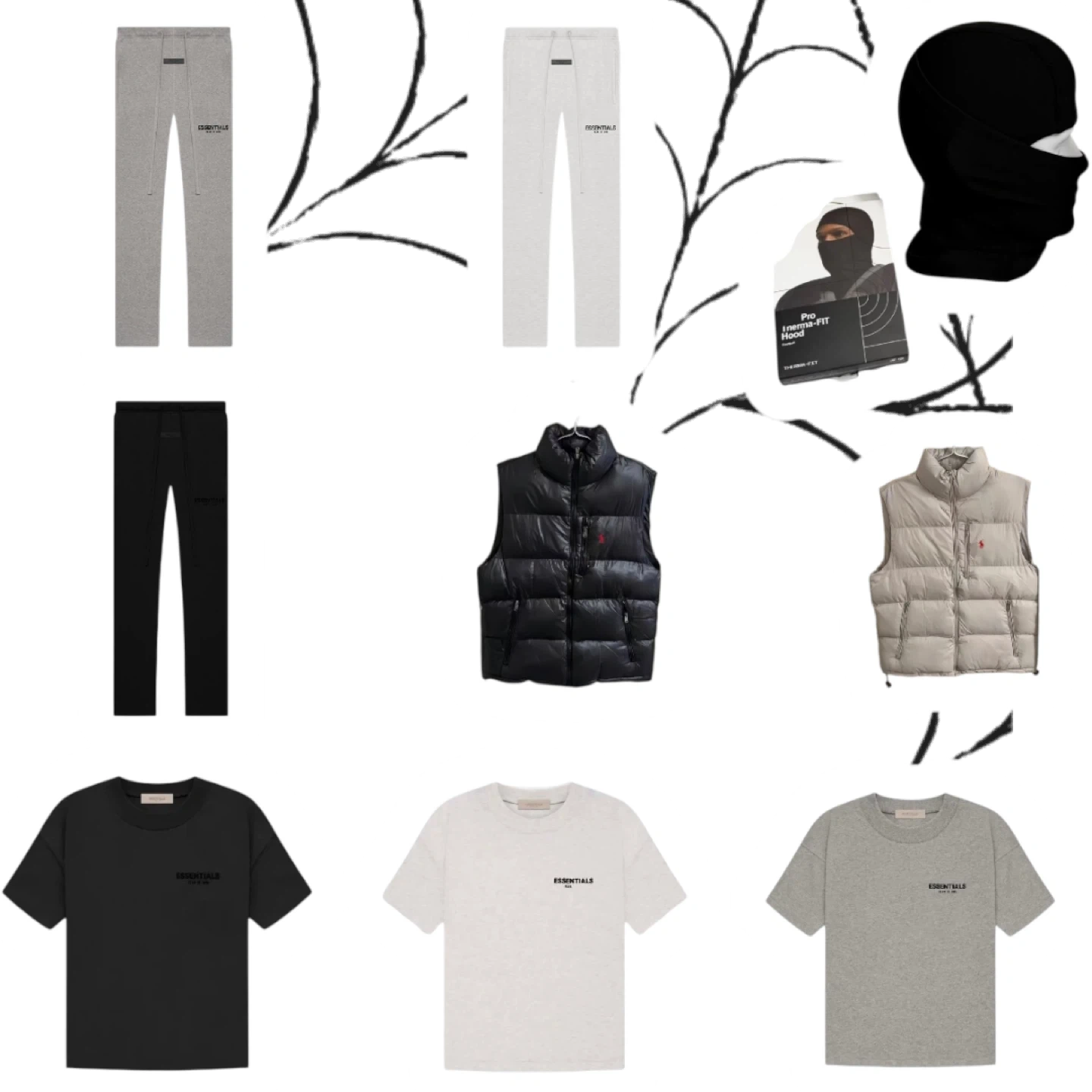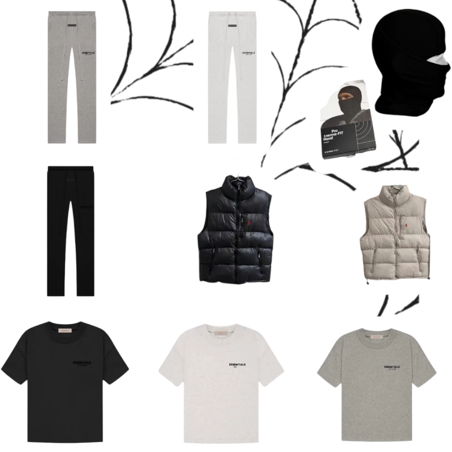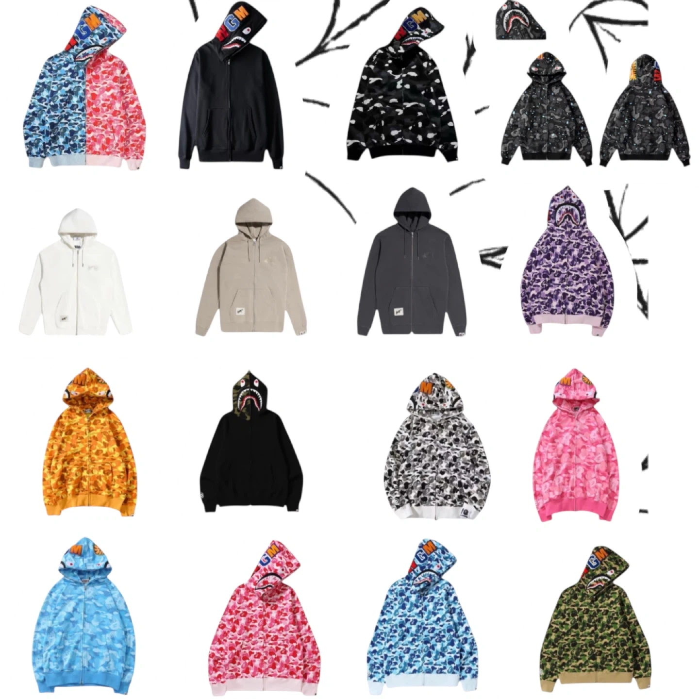 A selection of BAPE shark hoodies in various colours and patterns. Also includes Essentials brand clothing like t-shirts and pants. Great for streetwear enthusiasts!