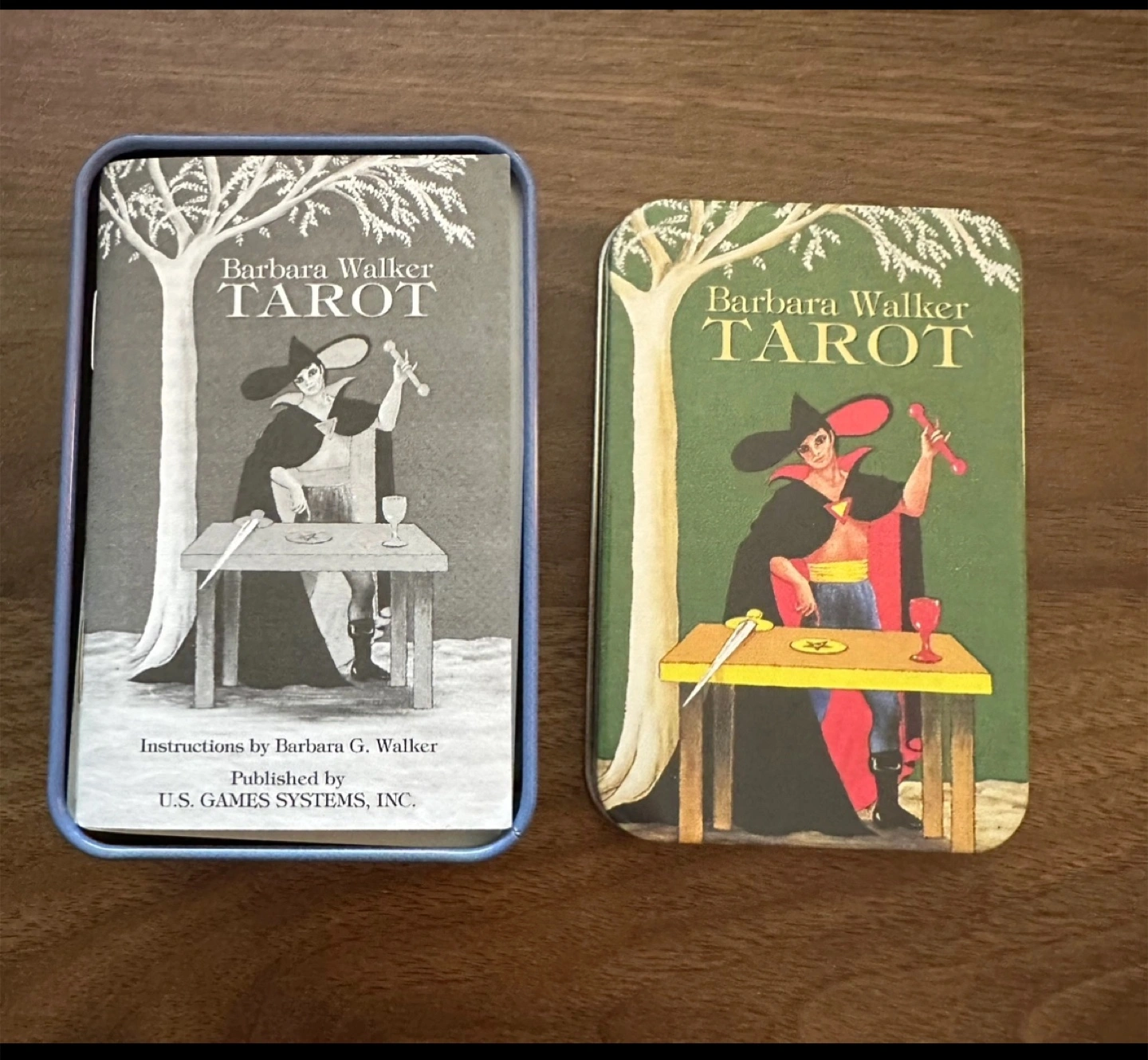 Conplete deck of tarot cards in a collectible metal tin with instruction booklet. Includes 78 pocket-sized cards with keywords in English, and a 48-page booklet. Cards are in mint condition. Barbara Walker Tarot reflects a unique feminist perspective of tarot with religious and pagan symbols from around the world. The Court Cards depict mythological gods and goddesses. Published by U.S. Games Systems, Inc. Cash Payment. Pick-Up in Pickering (Brock & 401).