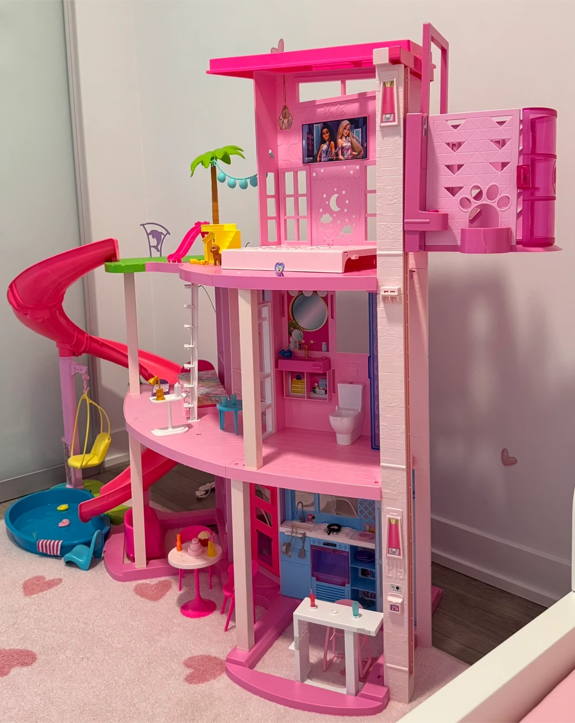 Selling a Barbie Dreamhouse with a pool party theme! It includes 75+ pieces and a 3-story slide, Barbie House playset, pet elevator, and puppy play areas. It's in great condition and ready for a new home! Originally bought for $249.97