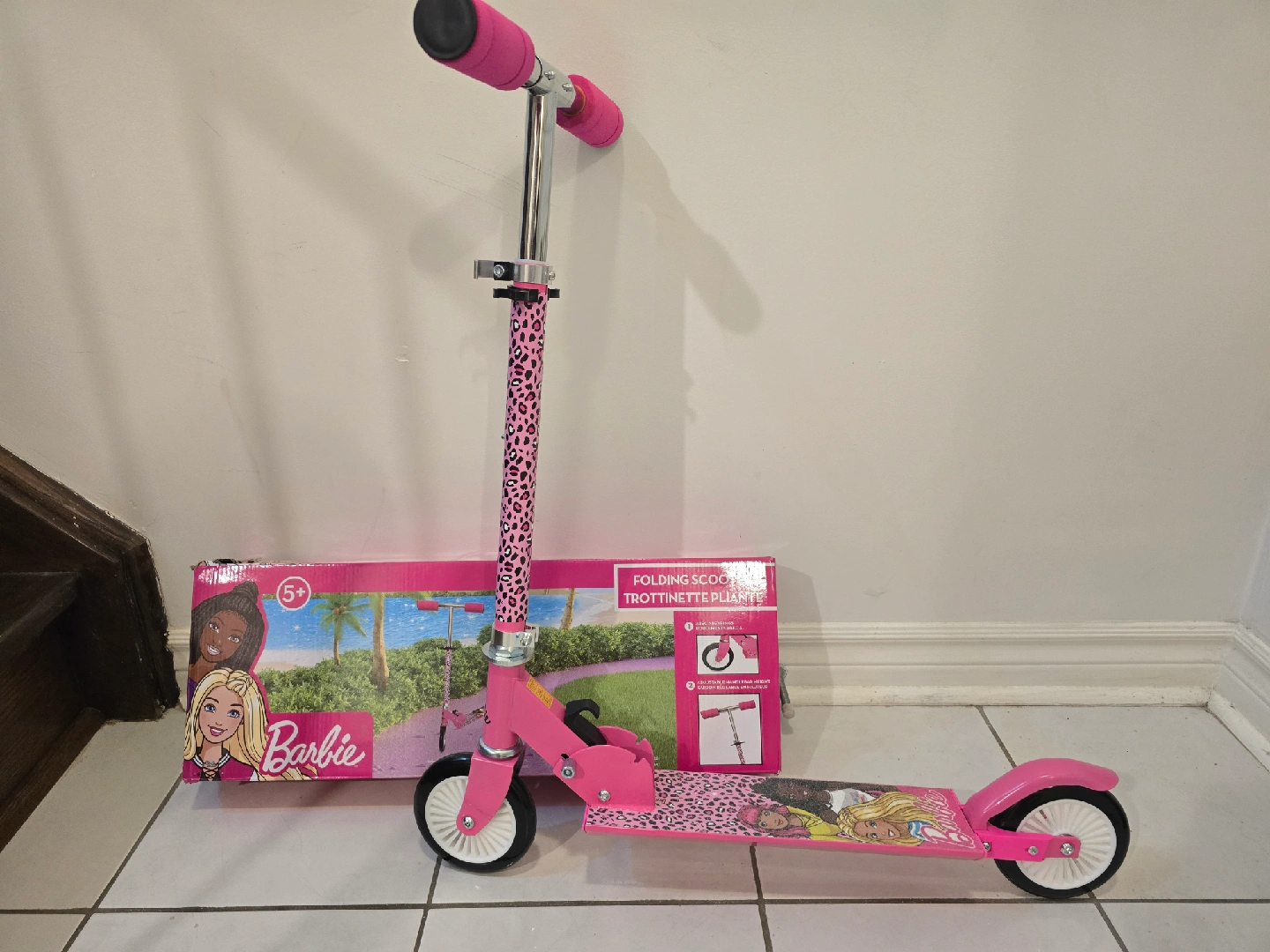 Selling a Barbie folding scooter, perfect for kids aged 5 and up! It was only tested 1 time, essentially brand new and ready for some fun rides.
