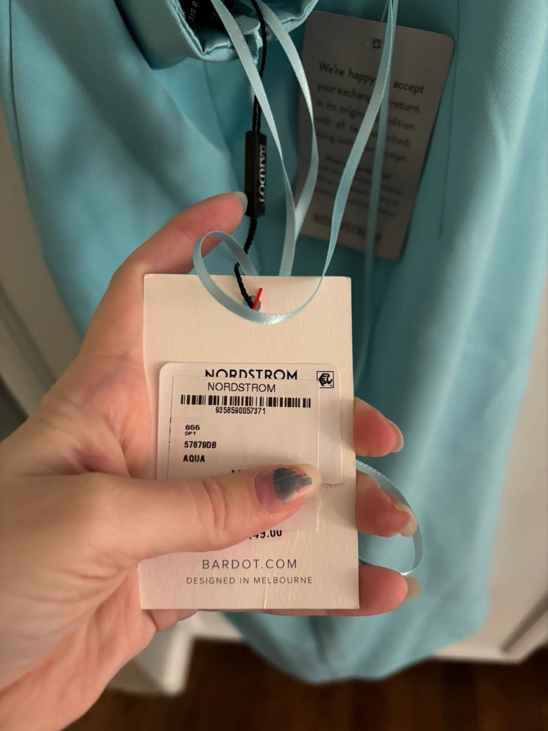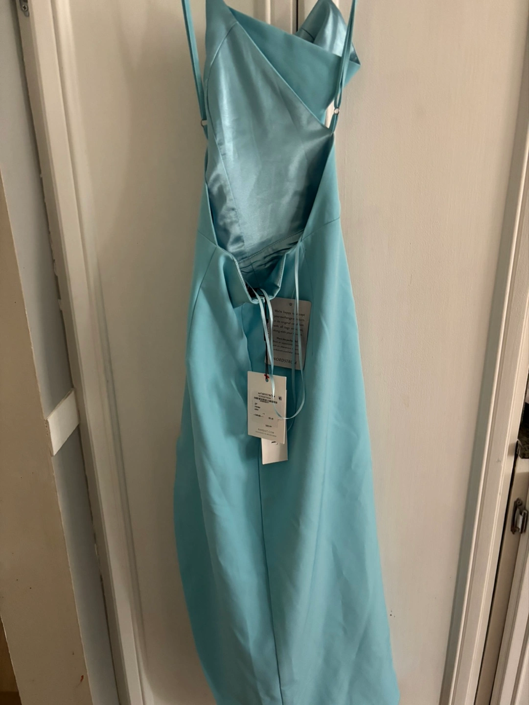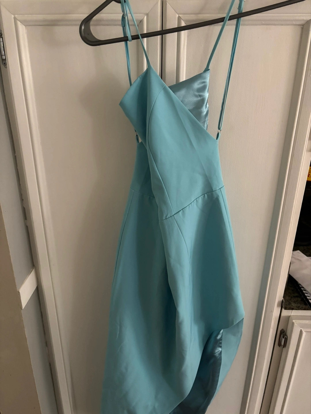 Stunning light blue mini dress. Features a unique asymmetrical design and thin straps. Lined bodice. Perfect for a special occasion.