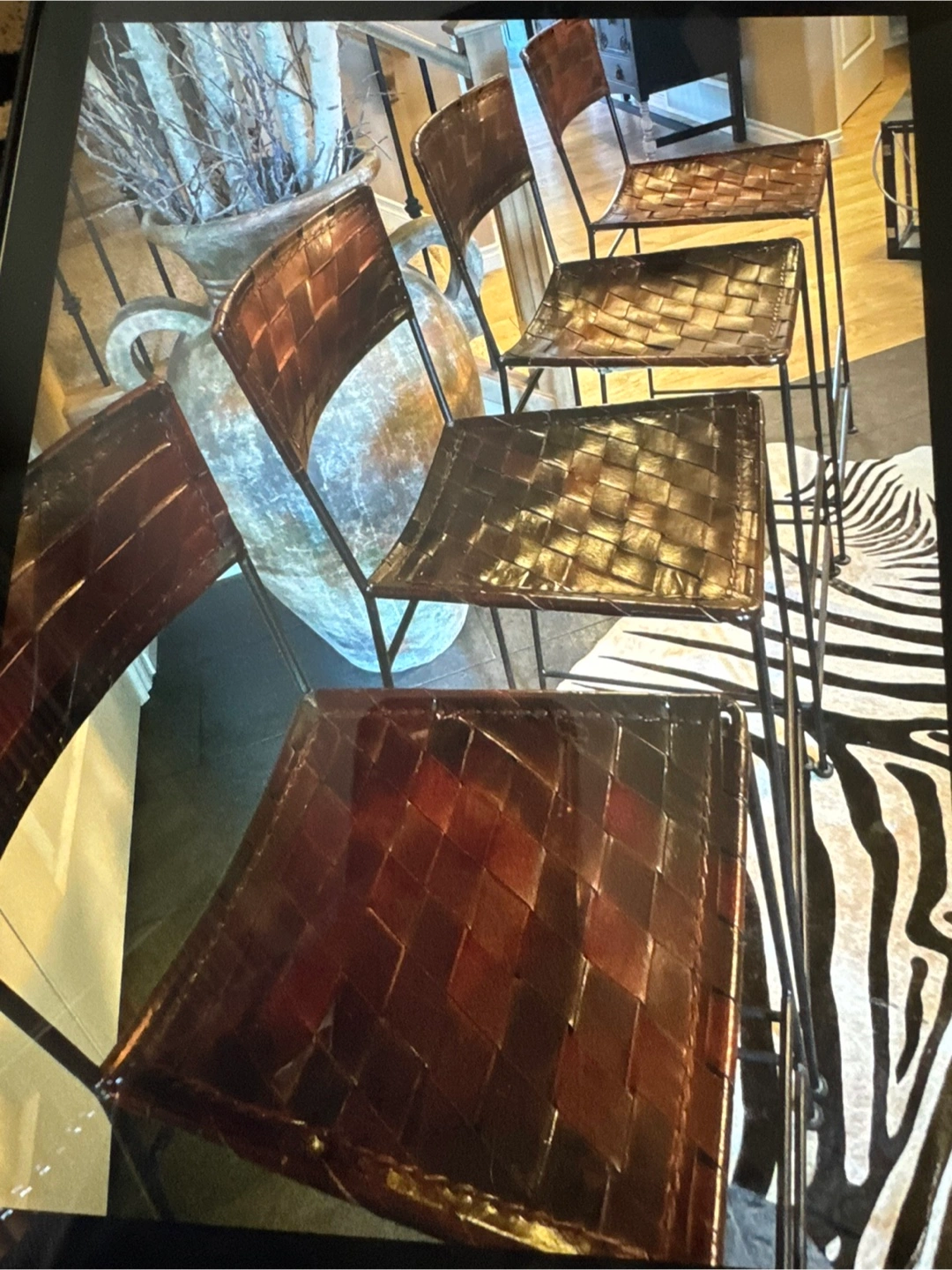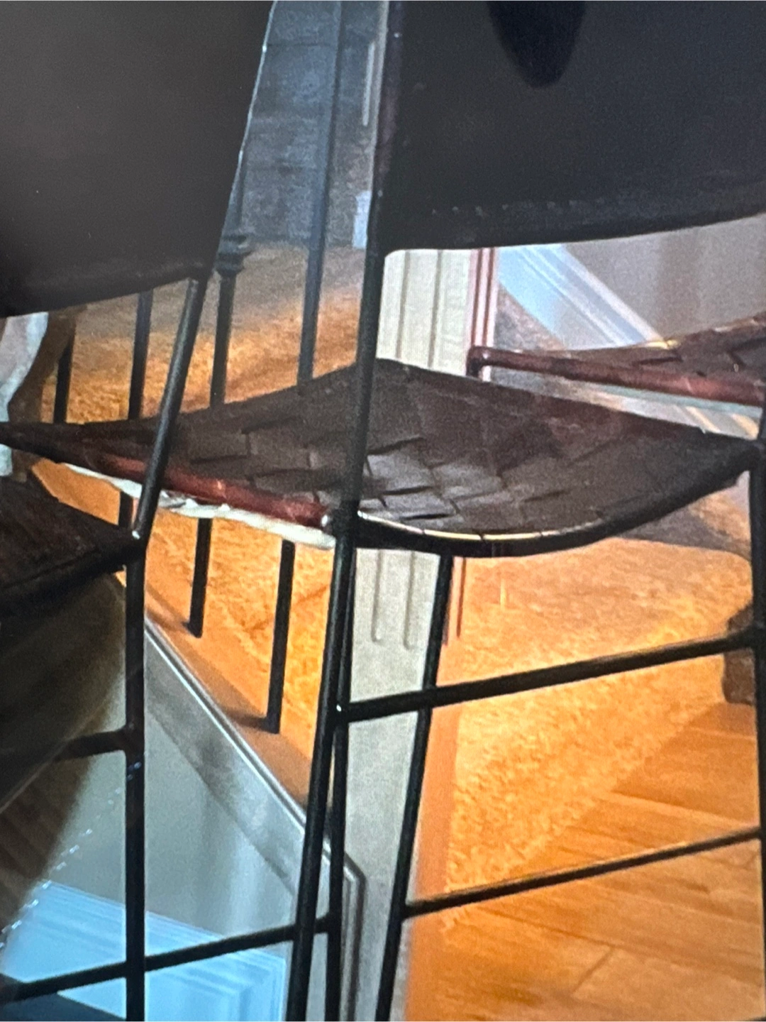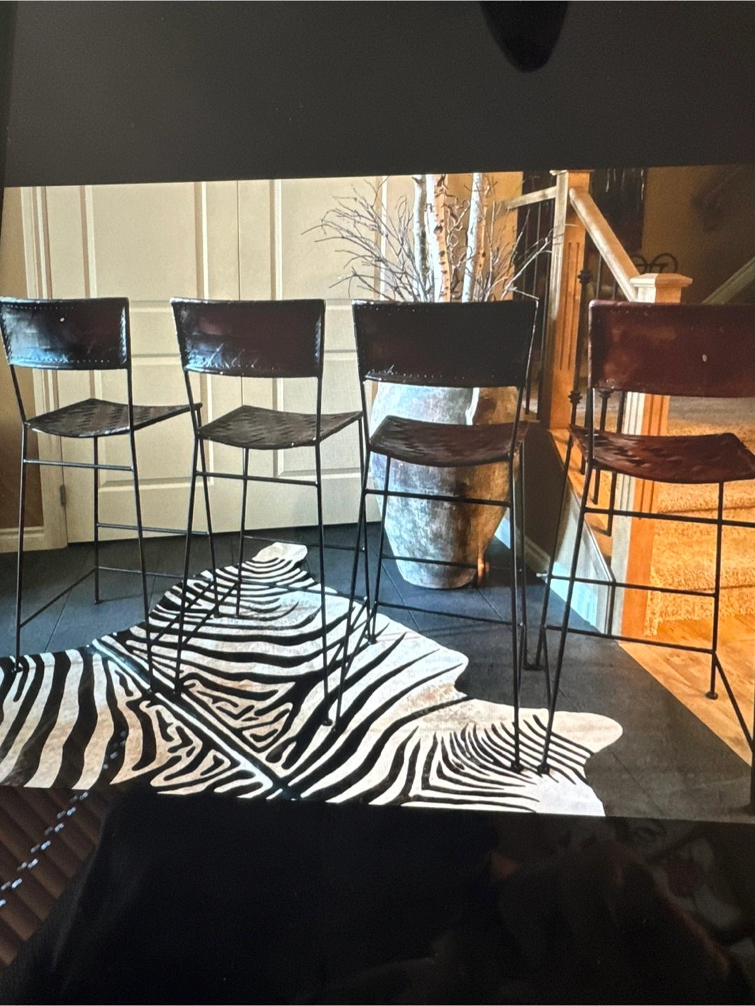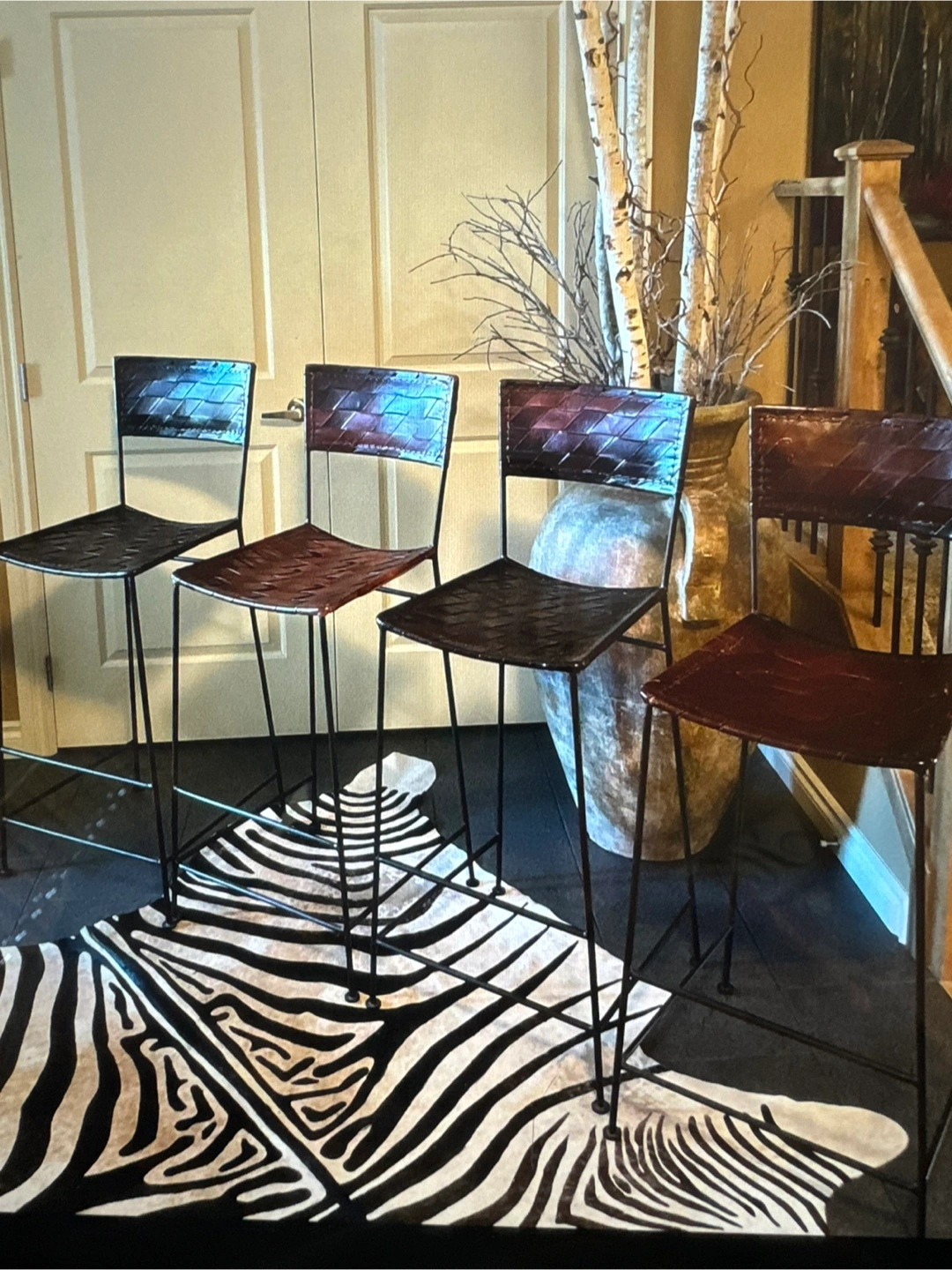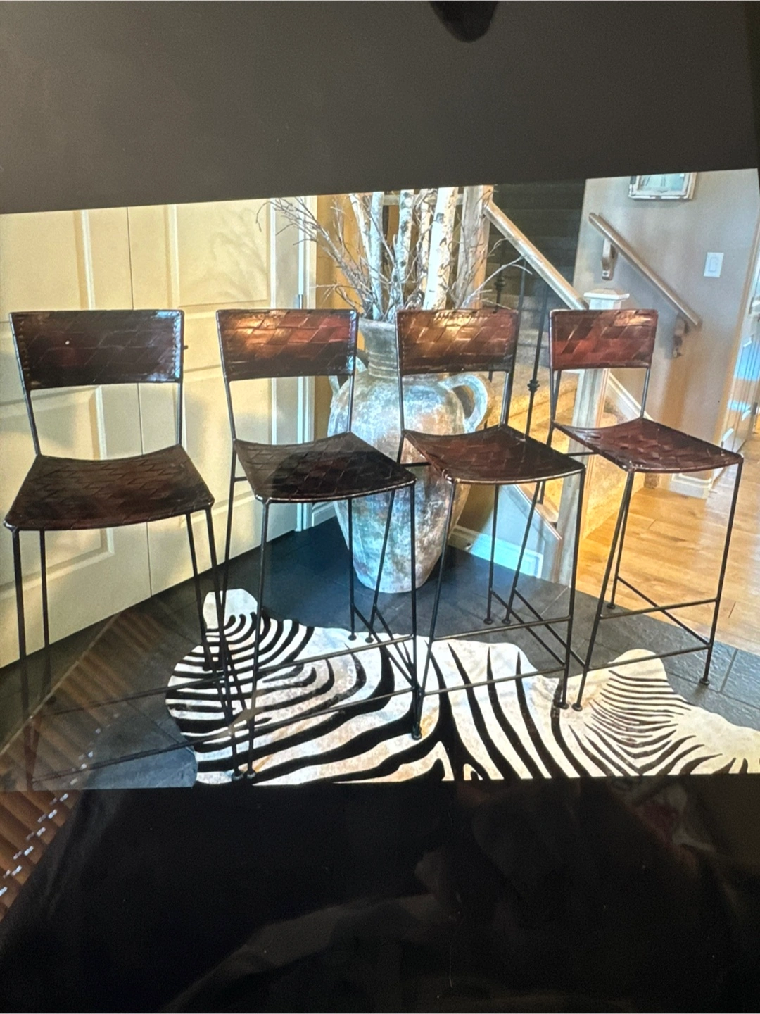 BARGAIN…only $75 each URBAN BARN was originally new $200+ each Selling a set of four wrought iron bar stools with woven leather seats and backs! They have a unique look and would be a great addition to any kitchen or bar area 29” from floor to seat 44” from floor to top of chair back * one chair under lining loose but seat still fine