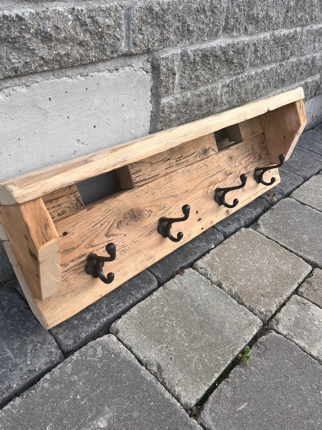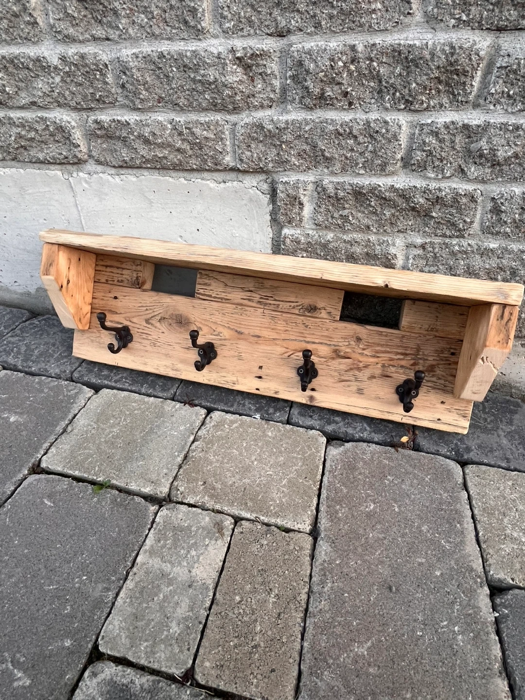 Custom Handmade Barn Board Coat Rack with 4 Cast Iron Hooks. All made from authentic Barn Board Beams. Very unique piece . Can be hung in entryway of your home/ cottage or garage. I custom make them to size. Size of this piece is 28” long, 9” height, with 6” deep shelf on top.