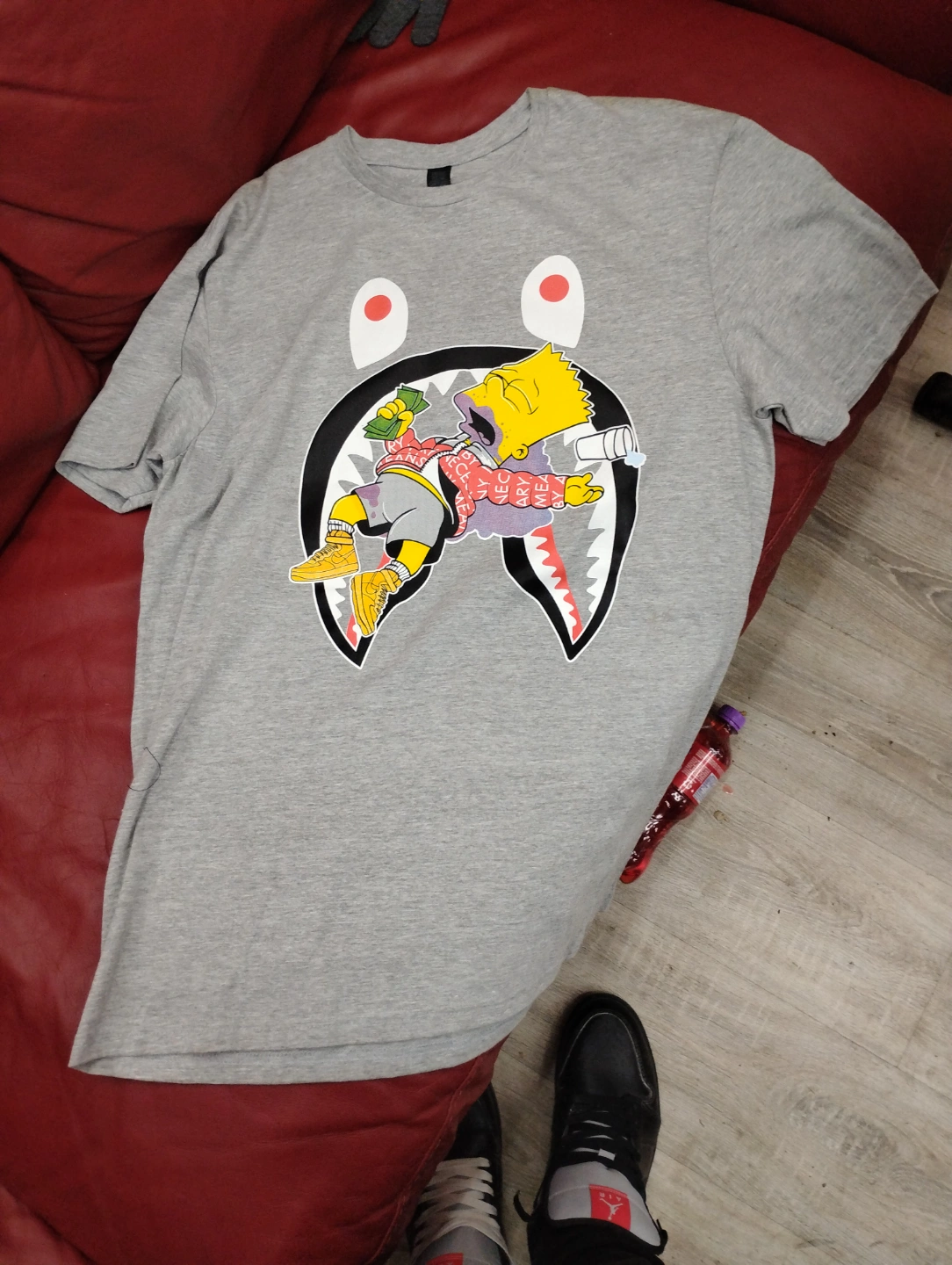 Grey t-shirt featuring Bart Simpson graphic. Short sleeves, crew neck. Casual wear.